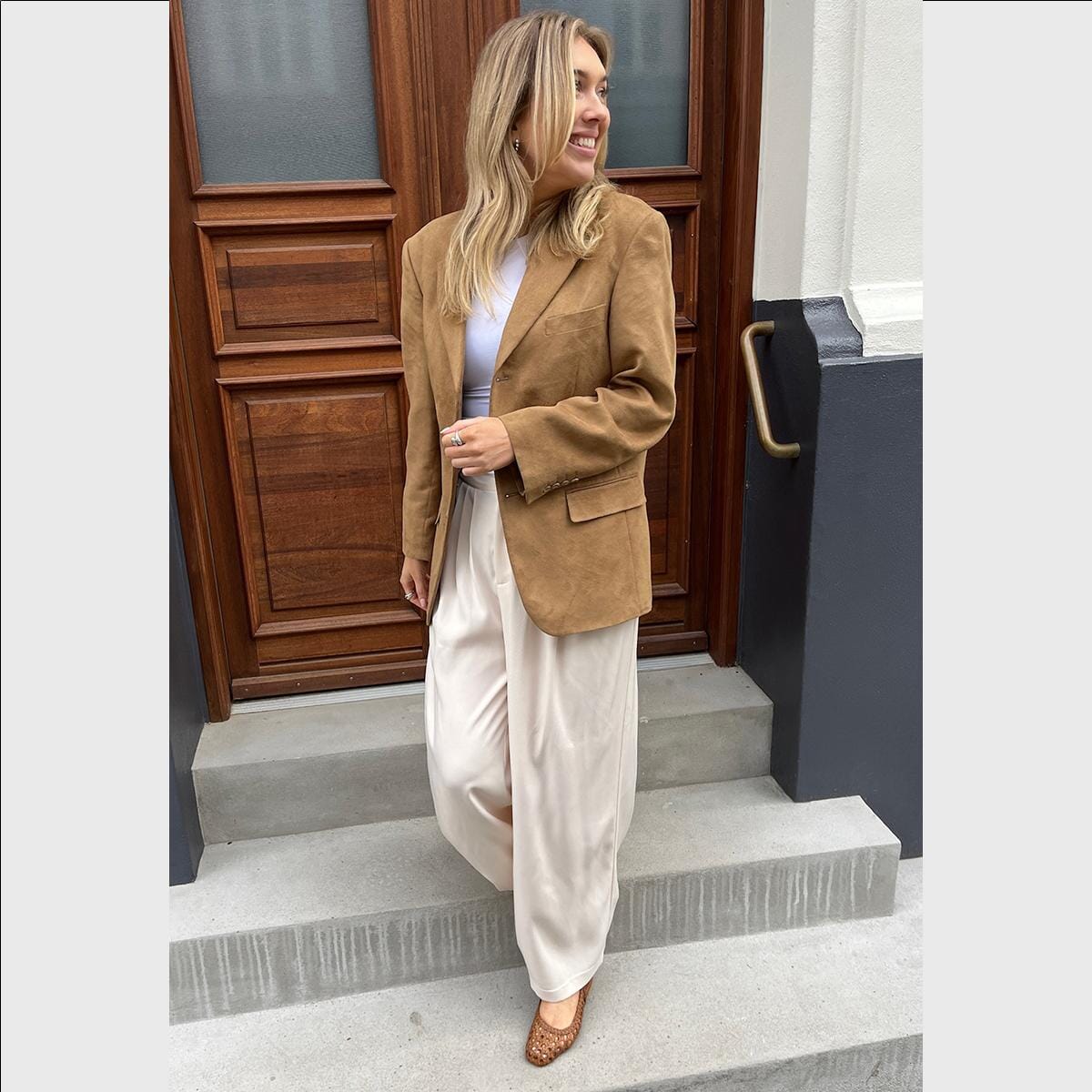 En ballerinasko fra Copenhagen Shoes, laget av semsket skinn i en brun cognac-nyanse. Skoen har en flettet overdel og en åpen hælrem.