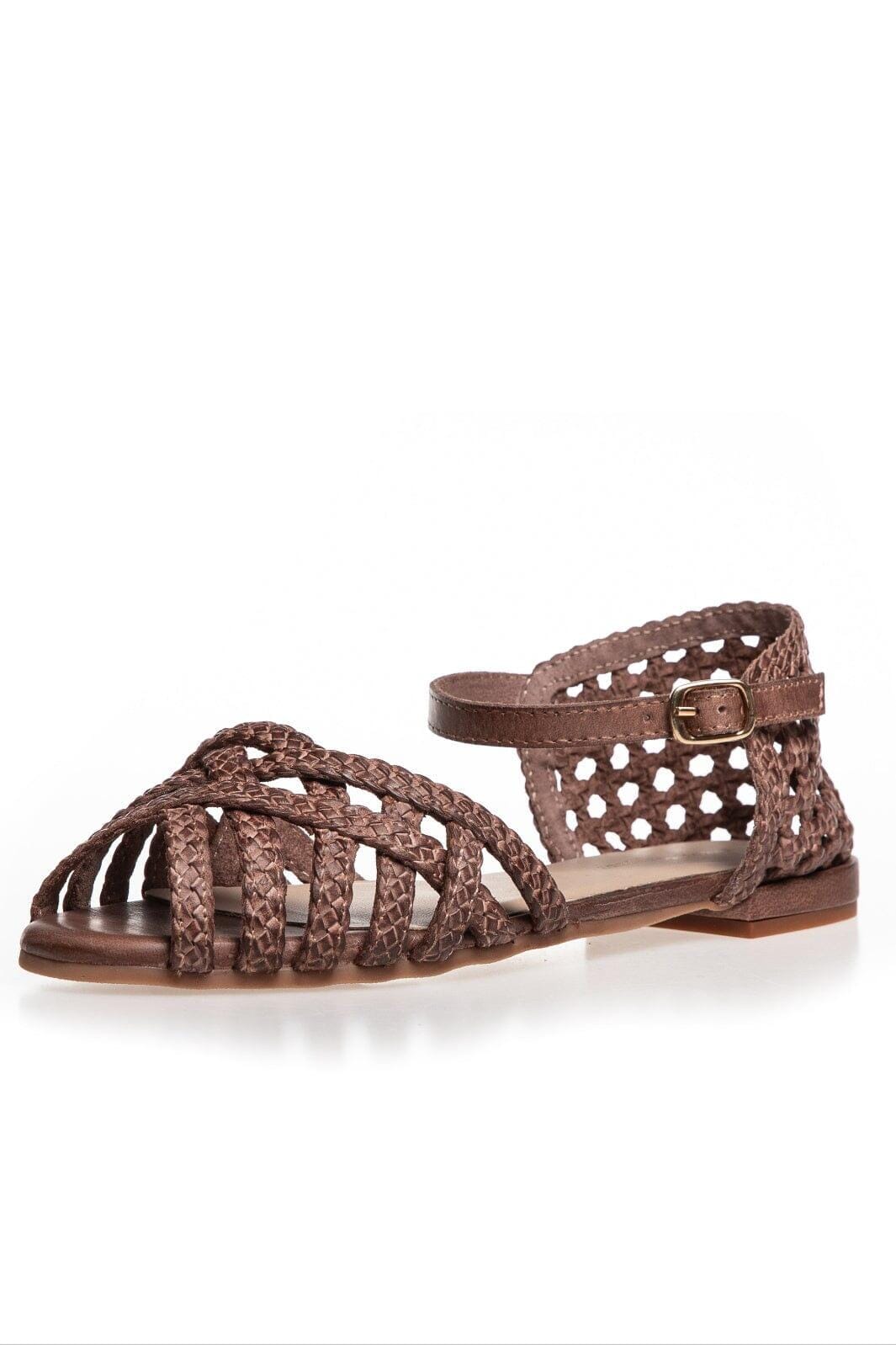 Brune sandaler fra Copenhagen Shoes, laget av skinn. Sandalen har et flettet design og en ankelrem med spenne.