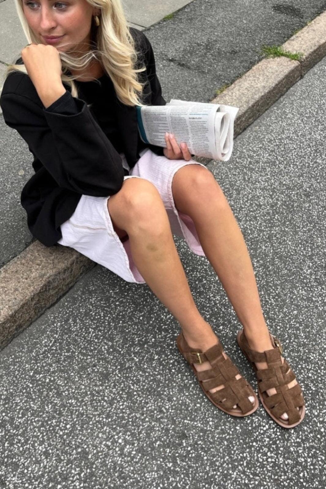 Brune sandaler fra Copenhagen Shoes, laget av semsket skinn. Sandalene har flere remmer over forfoten og en justerbar spenne på siden.