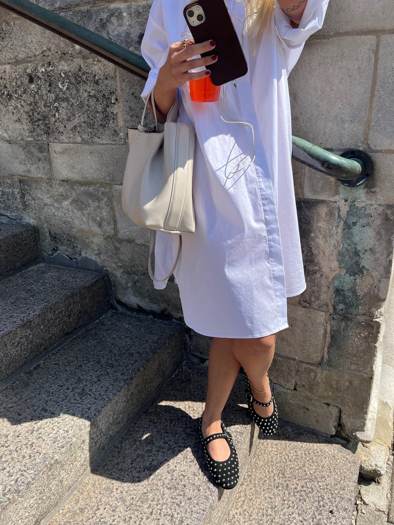 Svart ballerina i semsket skinn med sølvfargede nagler. Skoene har en rem over vristen og rund tå. De er designet med en flat såle.
