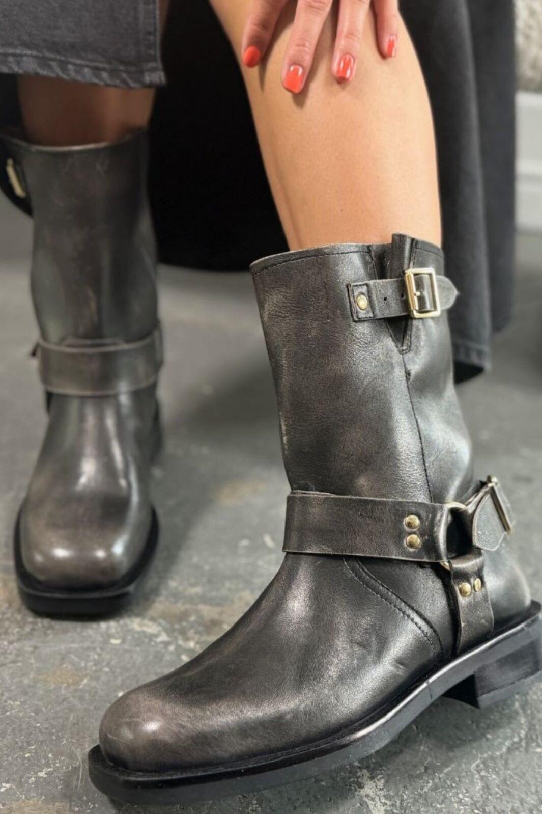 Svart og grå støvel fra Copenhagen Shoes i lær med skinnende finish. Støvelen har spenne-lukking med gulldetaljer og firkantet tå.
