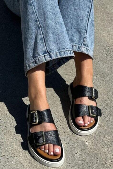 Sorte sandaler fra Copenhagen Shoes i lærred med en markant plattformsåle. De to justerbare spenner og den kraftige sålen gir sandalene deres karakteristiske uttrykk.