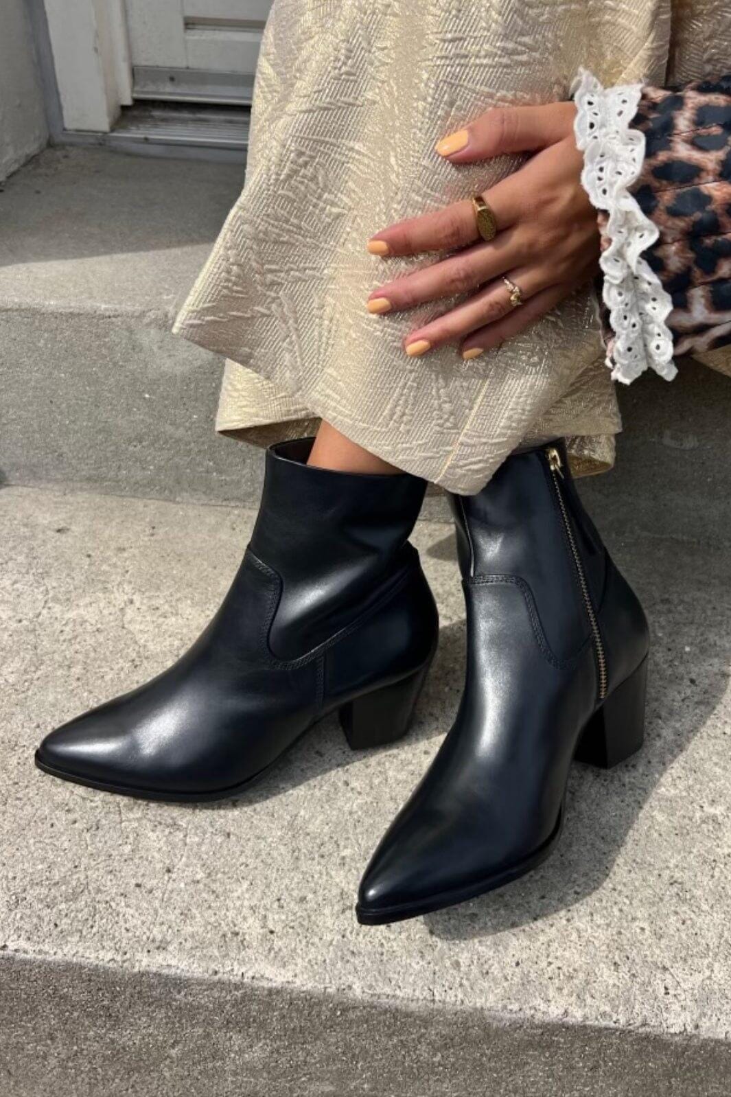 Sort ankelstøvel fra Copenhagen Shoes i lær med spiss tå. Støvelen har en blokkhelt og glidelås på siden.