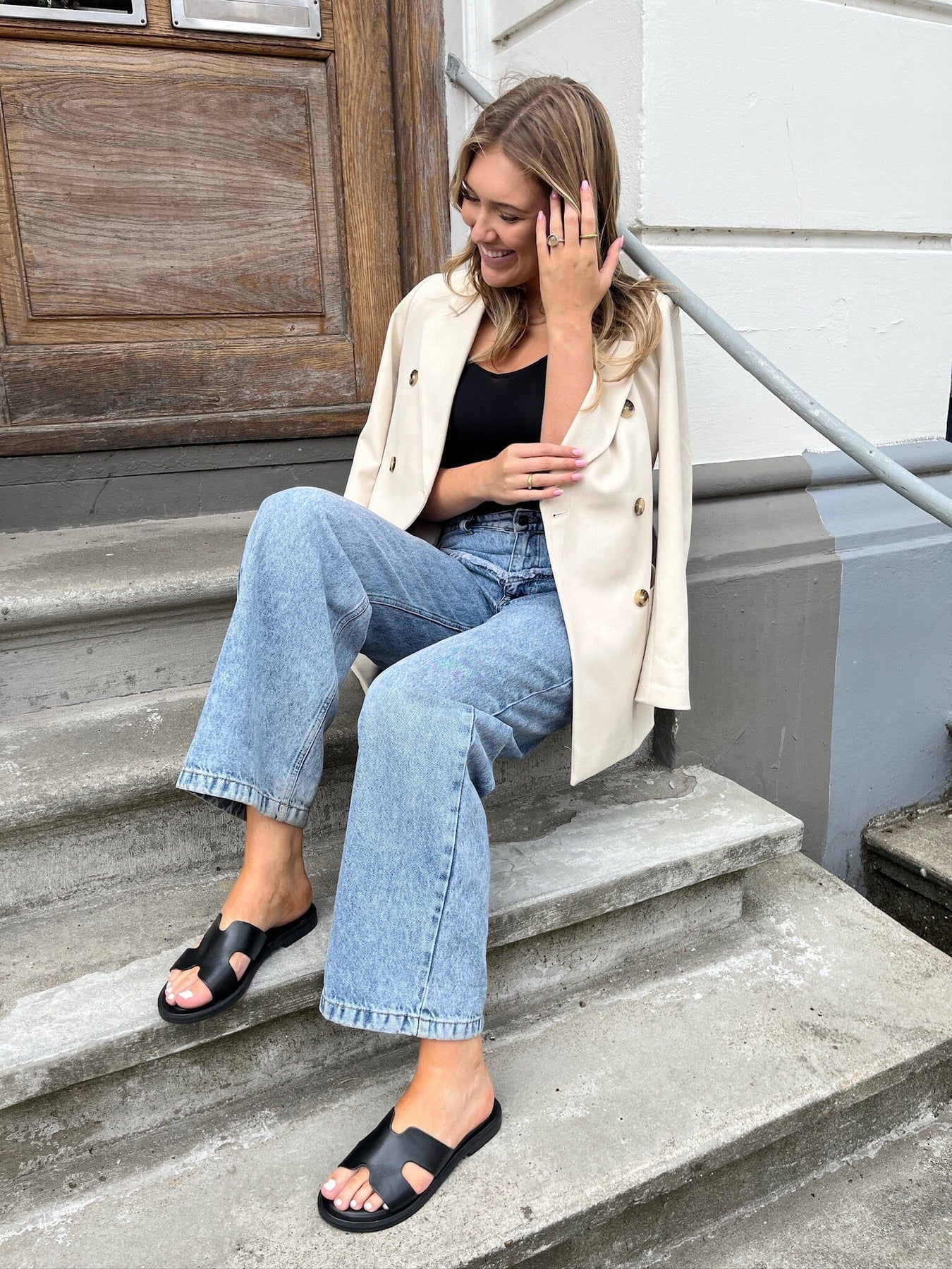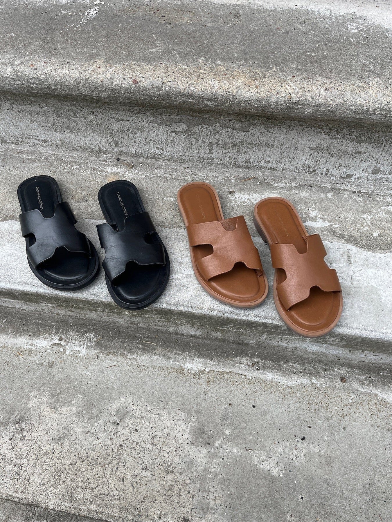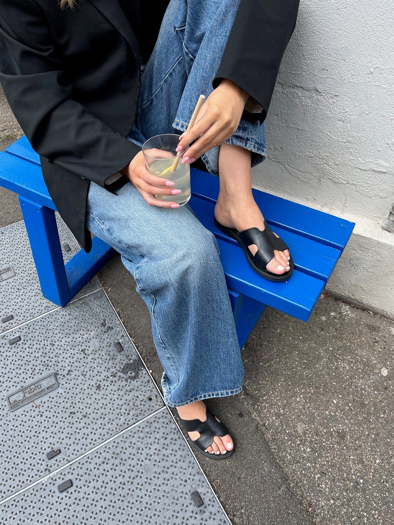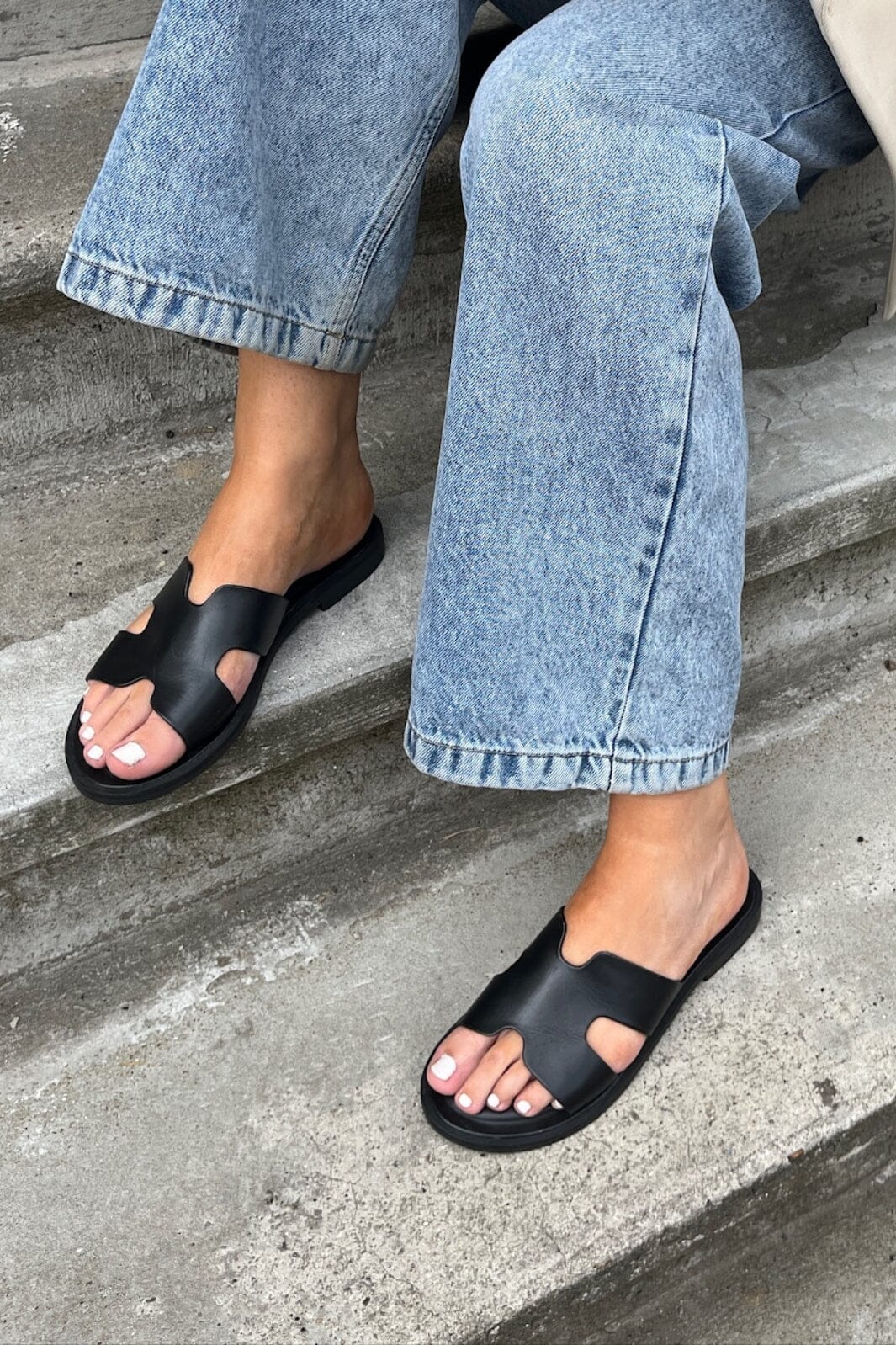 Sorte lædersandaler fra Copenhagen Shoes med et åbent design og H-formet udskæring på oversiden. Sandalerne har en flad sål og er fremstillet af blødt læder.