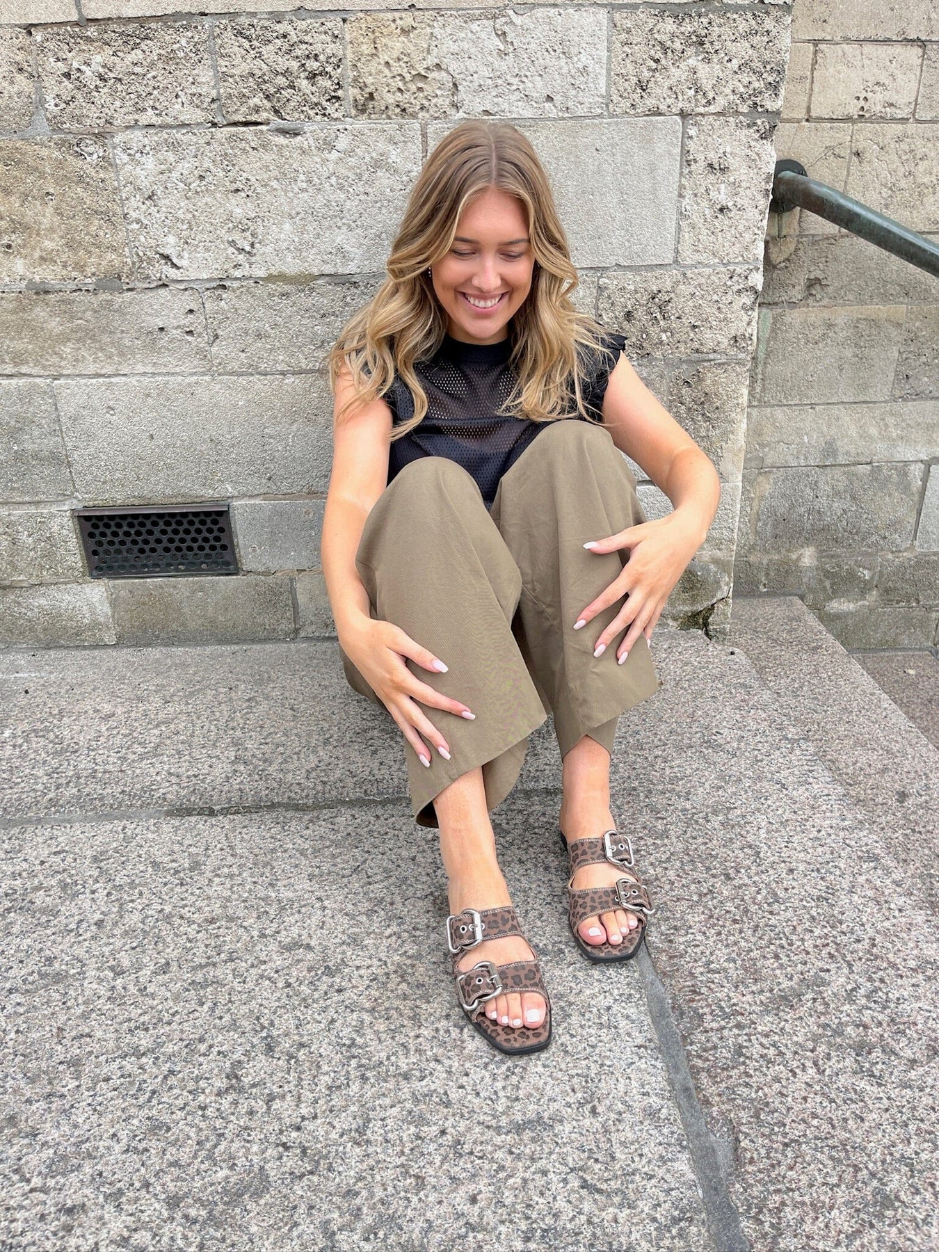 Sandal fra Copenhagen Shoes med brunt og svart leopardmønster. Den flate sandalen har to spenner og en åpen tå, som gjør den enkel å justere til foten.