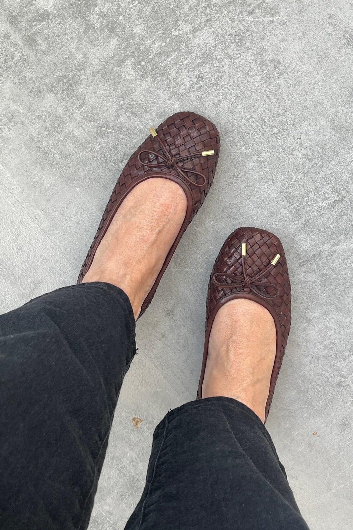 Ballerinasko fra Copenhagen Shoes i mørkebrunt skinn med flettet overflate og dekorativ sløyfe foran med metallender.