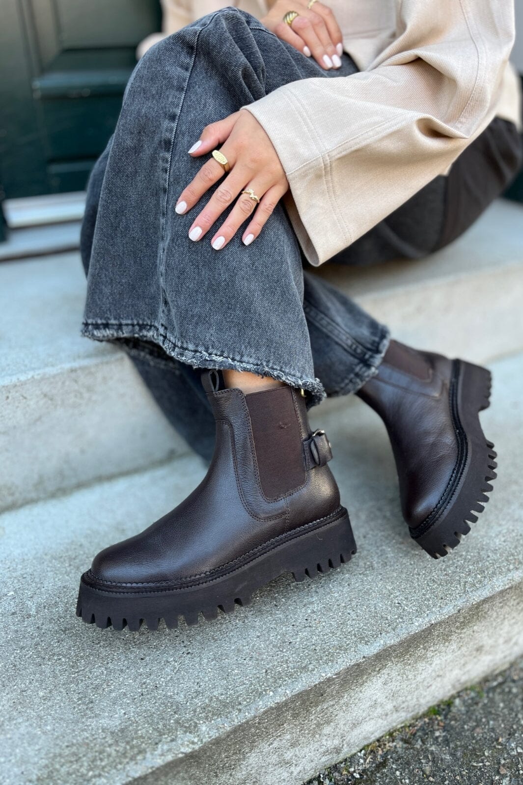 Mørkebrune ankelstøvler i lær med gulldetaljer og kraftig EVA-såle. Støvelen har elastiske sider og en spesialdesignet innersåle med ekstra polstring.