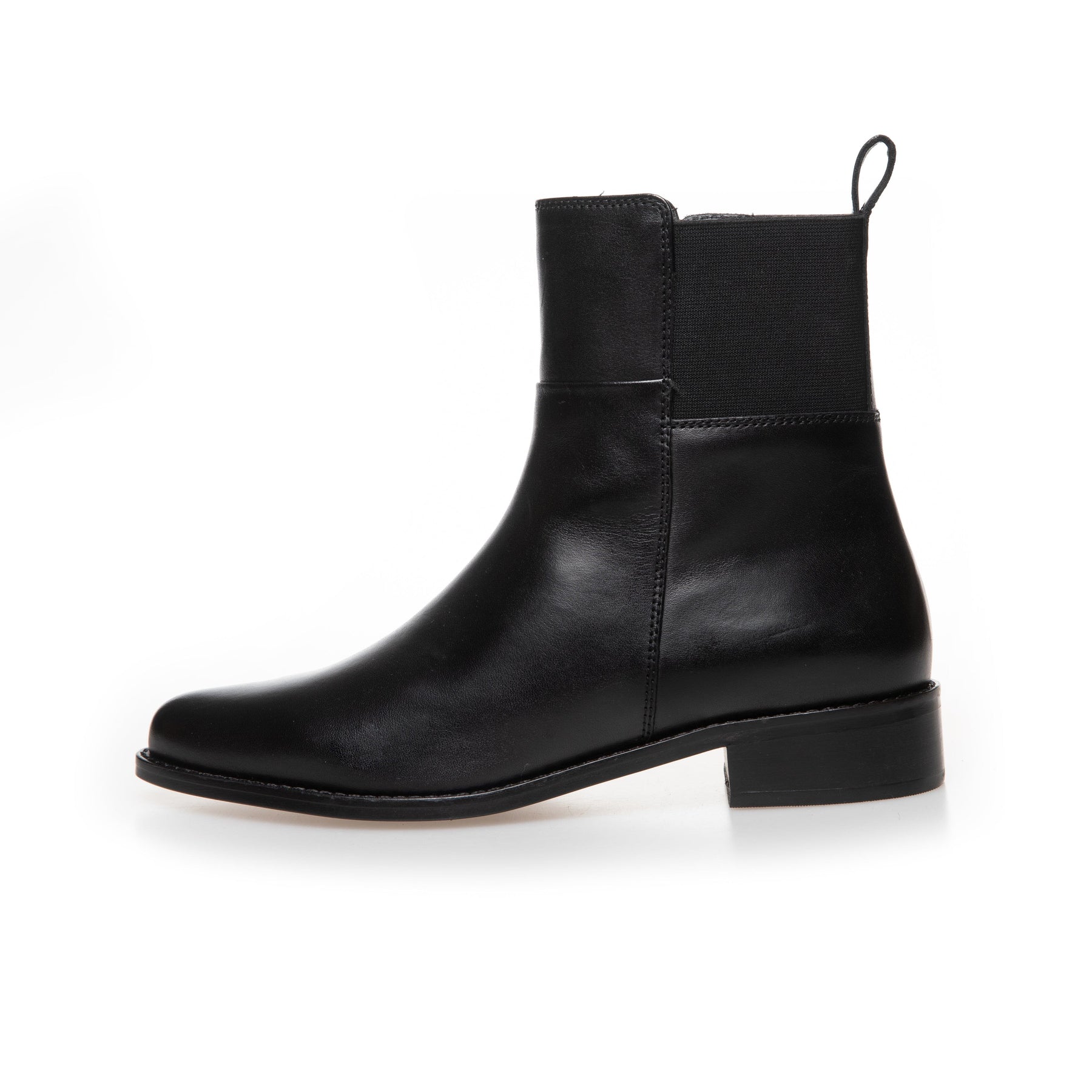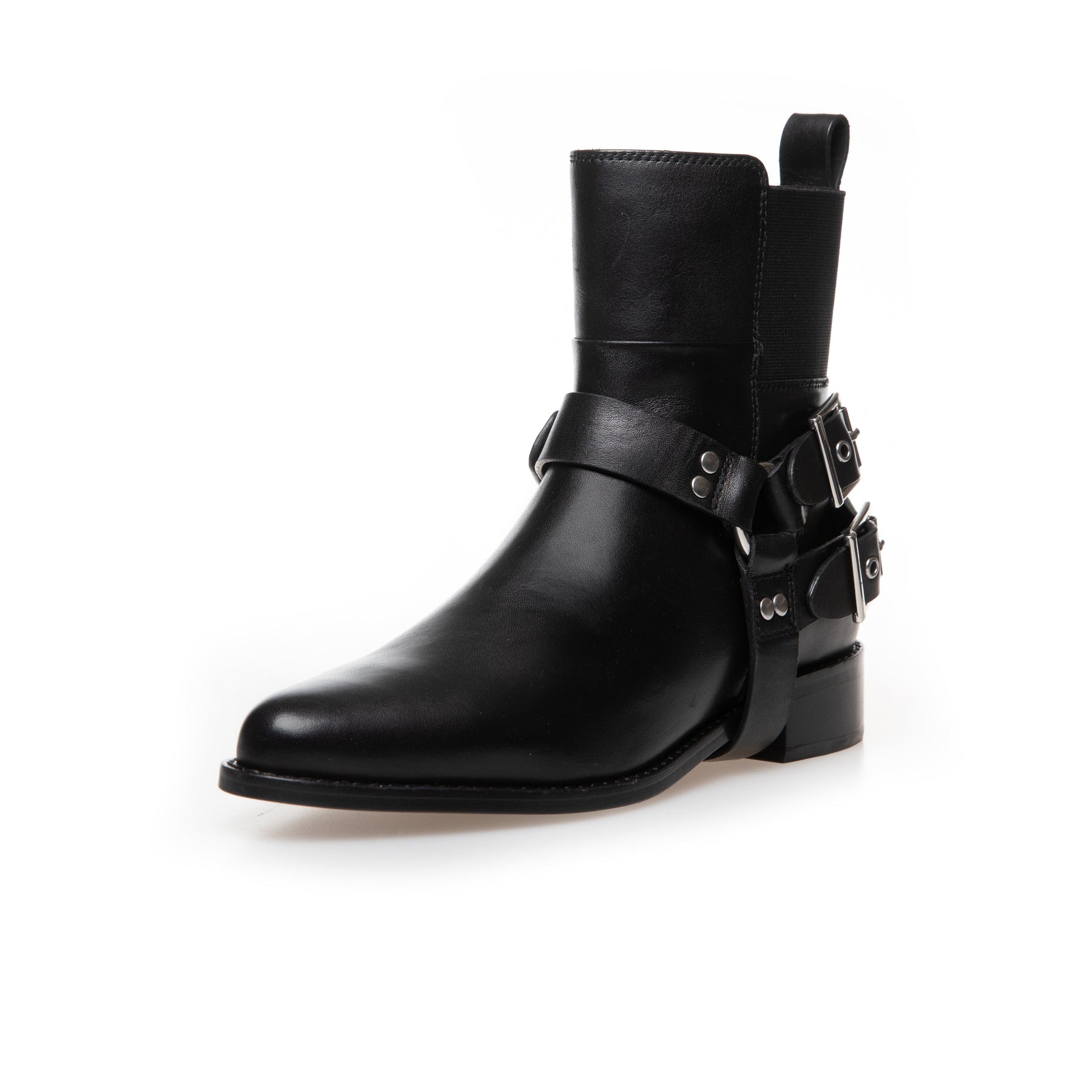 Sort ankelstøvel i lær med to spenner på siden. Støvelen har en spiss tå og en lav blokkhelt som gir god støtte ved gange.