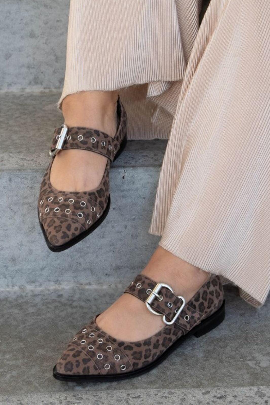 Semsket sko fra Copenhagen Shoes med brunt leopardmønster. Skoen har spiss tå og spenne-lukking med nagler som detalj. Den flate hælen gir god støtte.