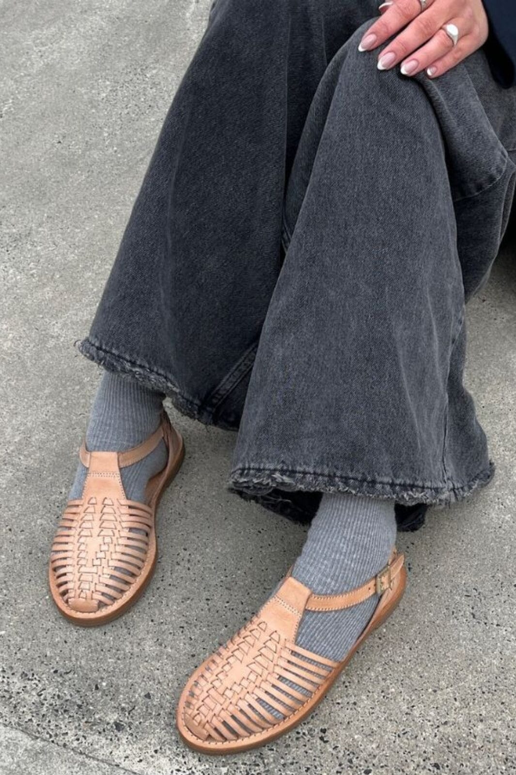 Sandal fra Copenhagen Shoes i naturfarget skinn med flettede remmer. De myke remmene og den lukkede hælkappen gir både støtte og ventilasjon til foten.