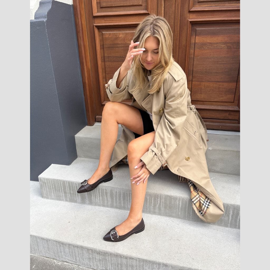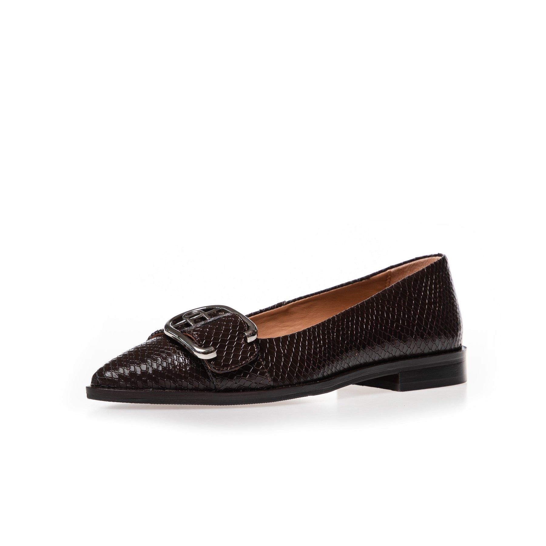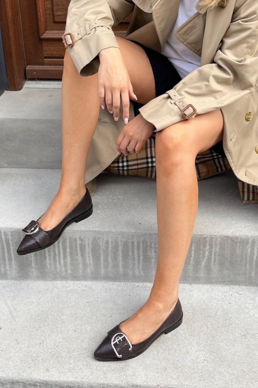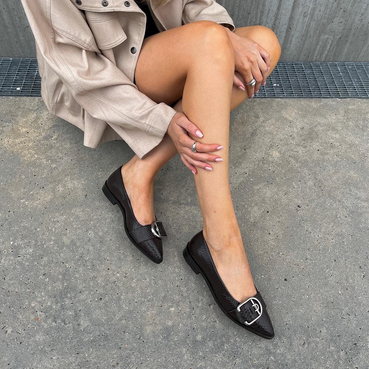 Flate sko fra Copenhagen Shoes, laget av skinn i en mørkebrun farge. Skoen har en spiss tå og et synlig spenne på forsiden.