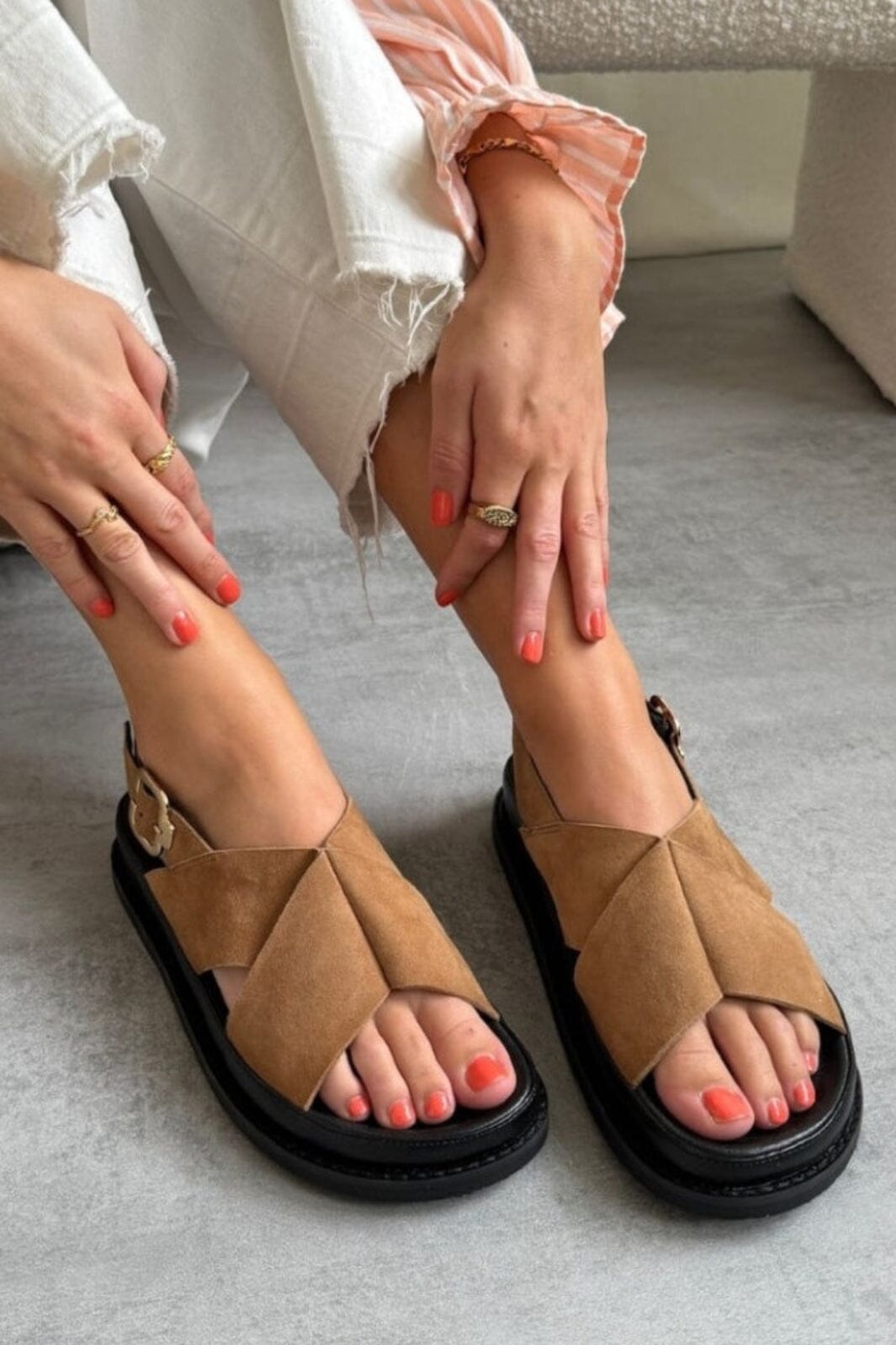 Sandaler fra Copenhagen Shoes i semsket skinn og lær. Sandalene har en brun nyanse og et kryssende design på den øvre delen.