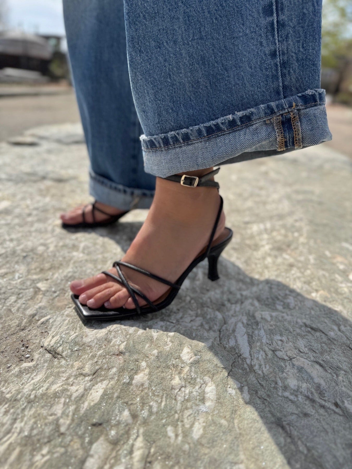 Sorte stiletter i lær med kryssende remmer over foten og ankelrem med spenne. Firkantet tå og stiletthæl gir skoene et rent og enkelt design.