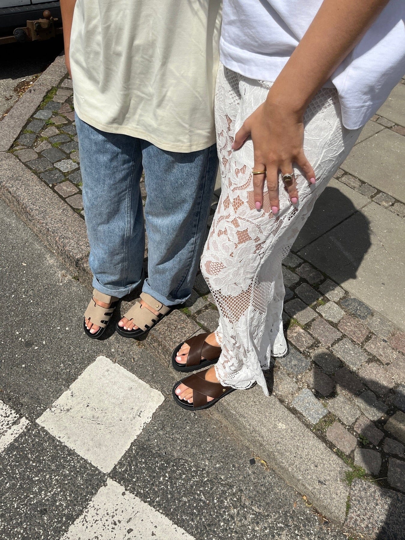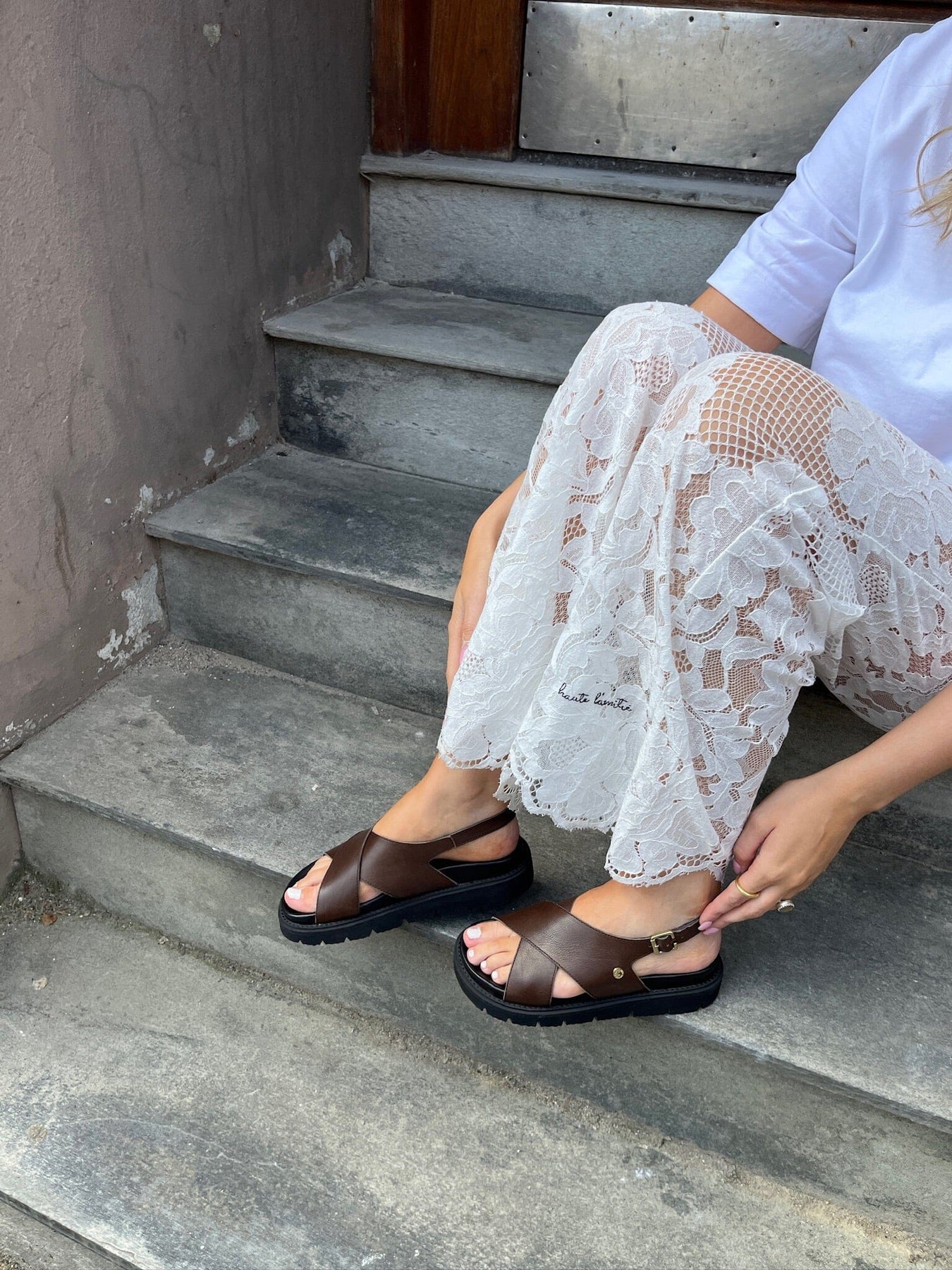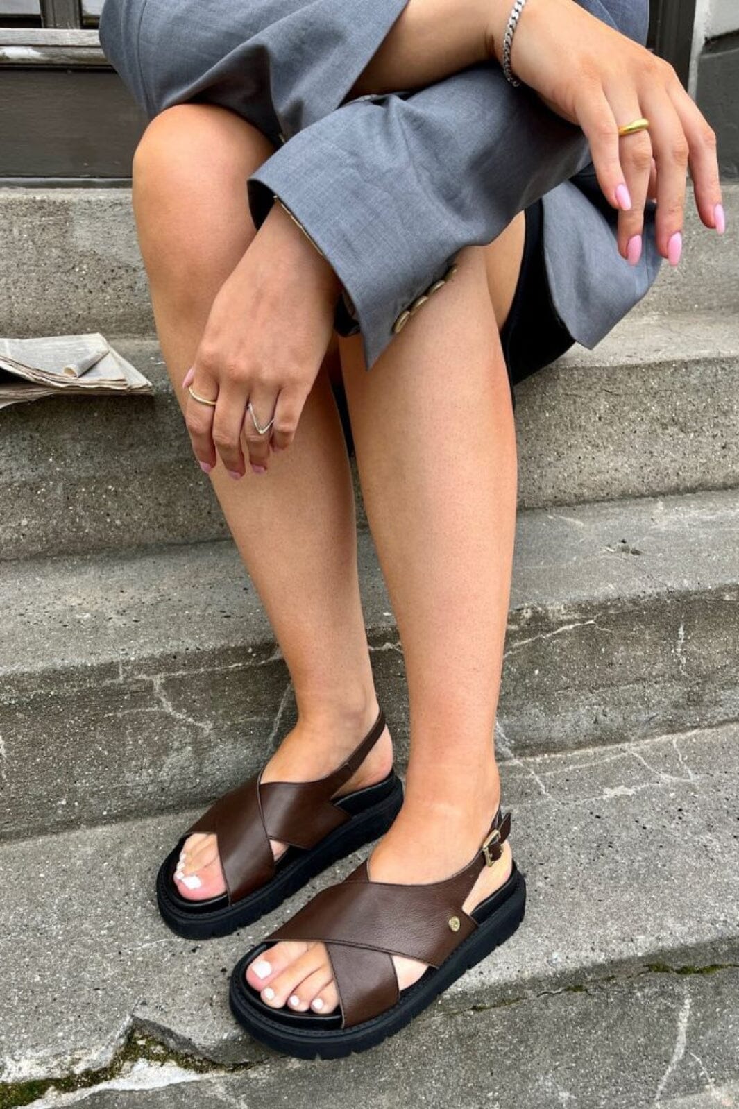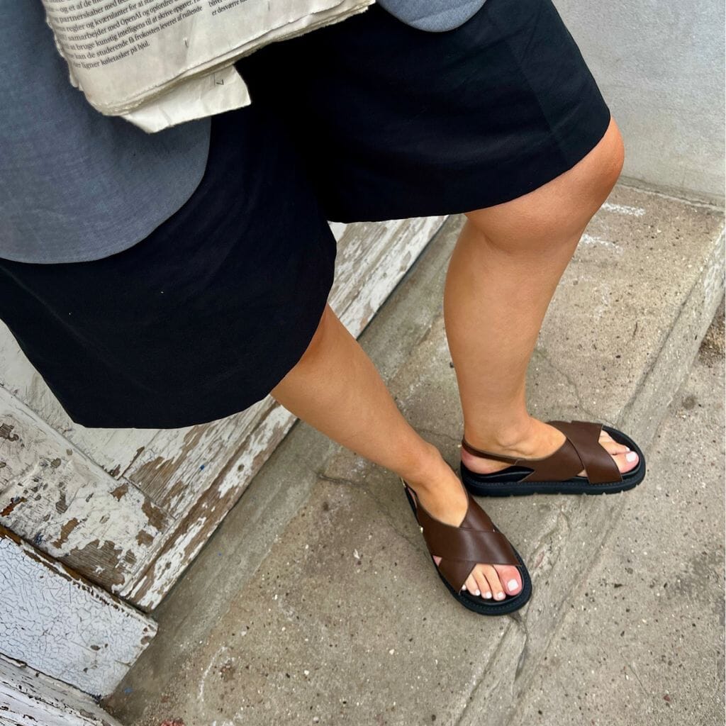 Mørkebrun sandal fra Copenhagen Shoes med kryssremmer og forgylt spenne. Sandalene har en svart chunky EVA-såle og er laget av mykt lær med justerbar hælrem.