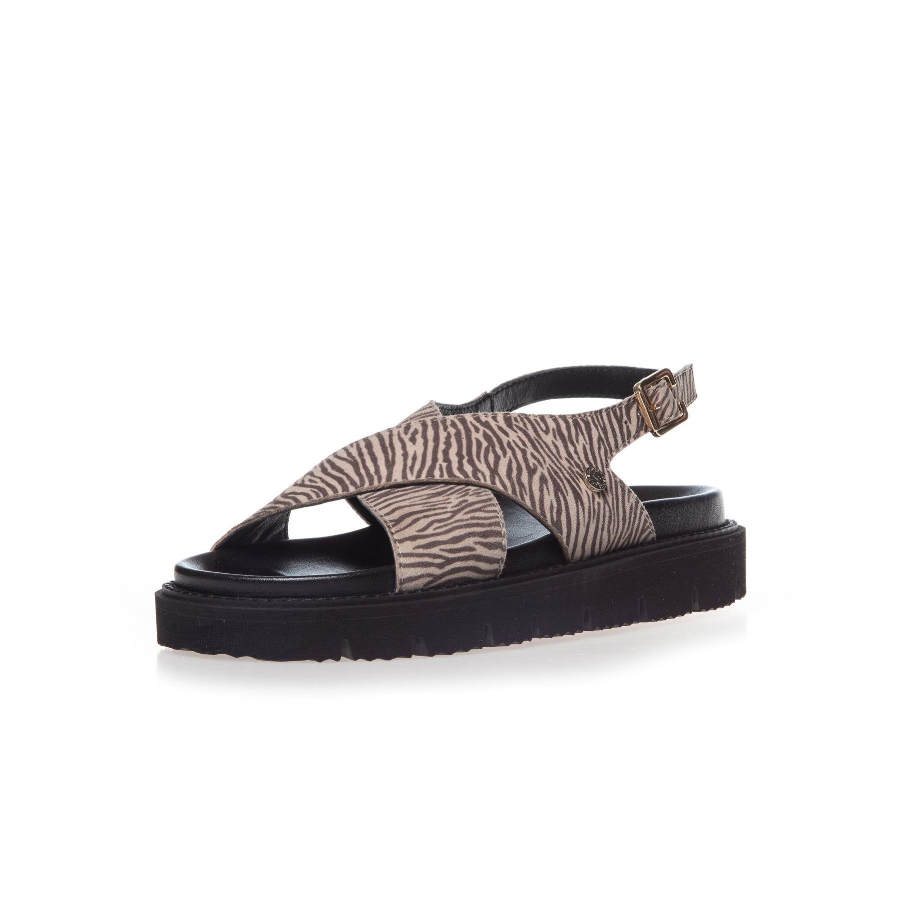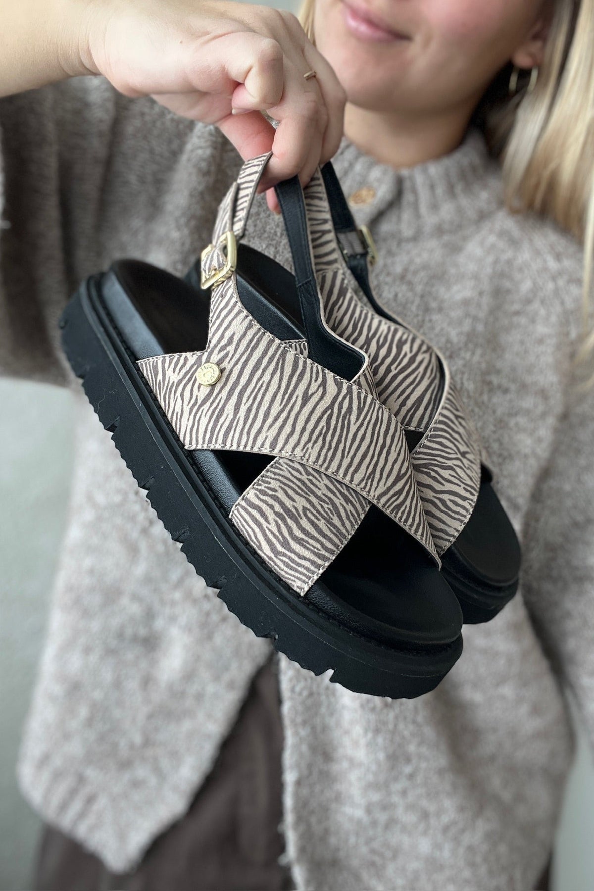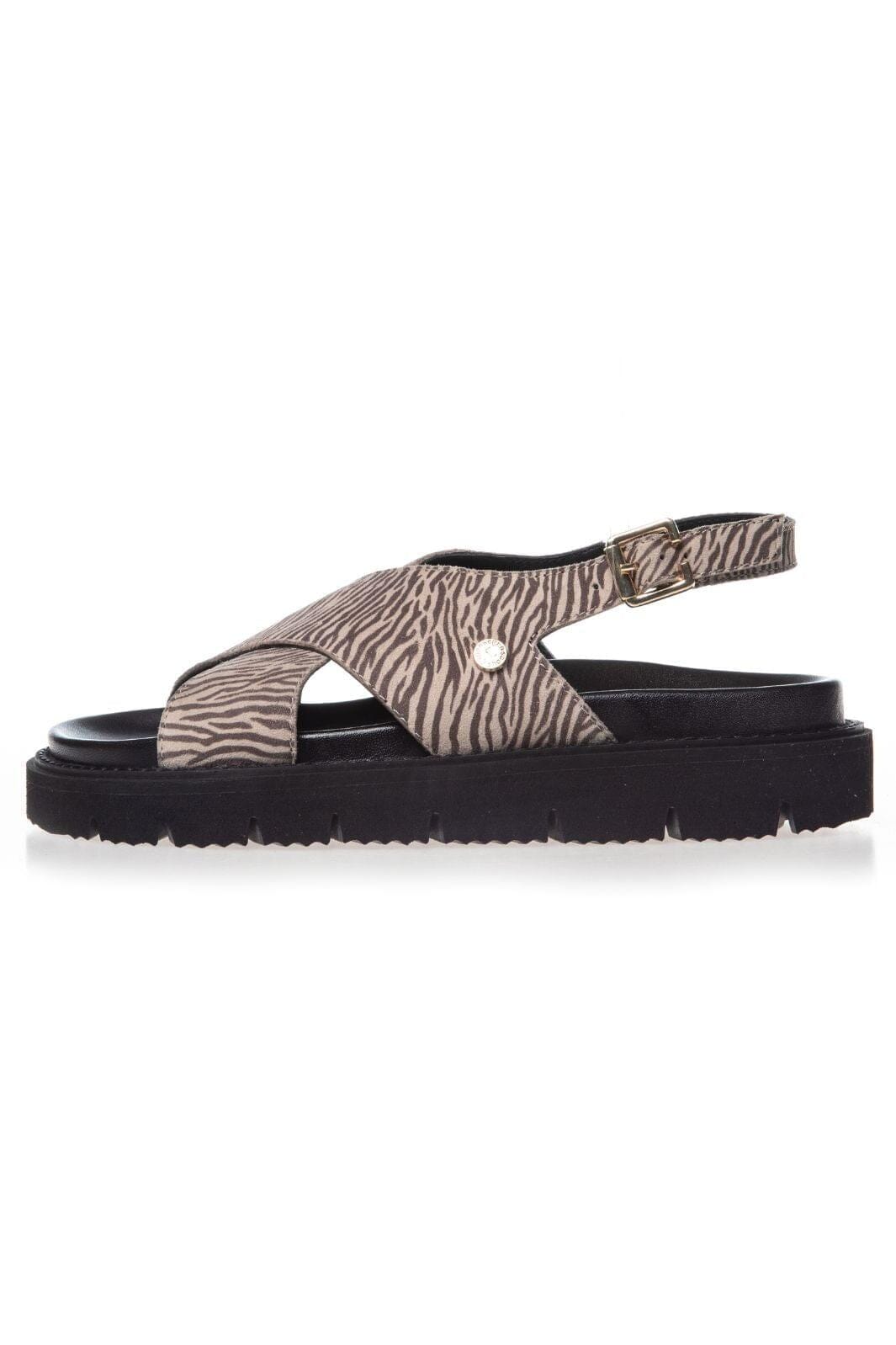 Sandaler fra Copenhagen Shoes, laget av semsket skinn i beige og brune nyanser. Sandalene har et kryssmønstret design med en tykk, svart såle.