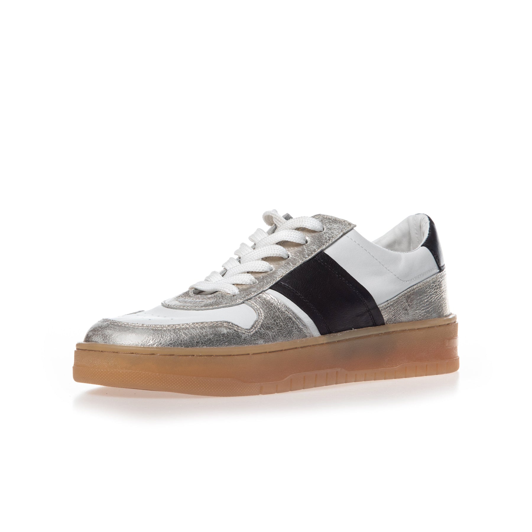Sneakers fra Copenhagen Shoes i sølvfarget skinn. Skoen har sølv- og hvitfargede paneler med en svart stripe på siden og en tykk brun såle.