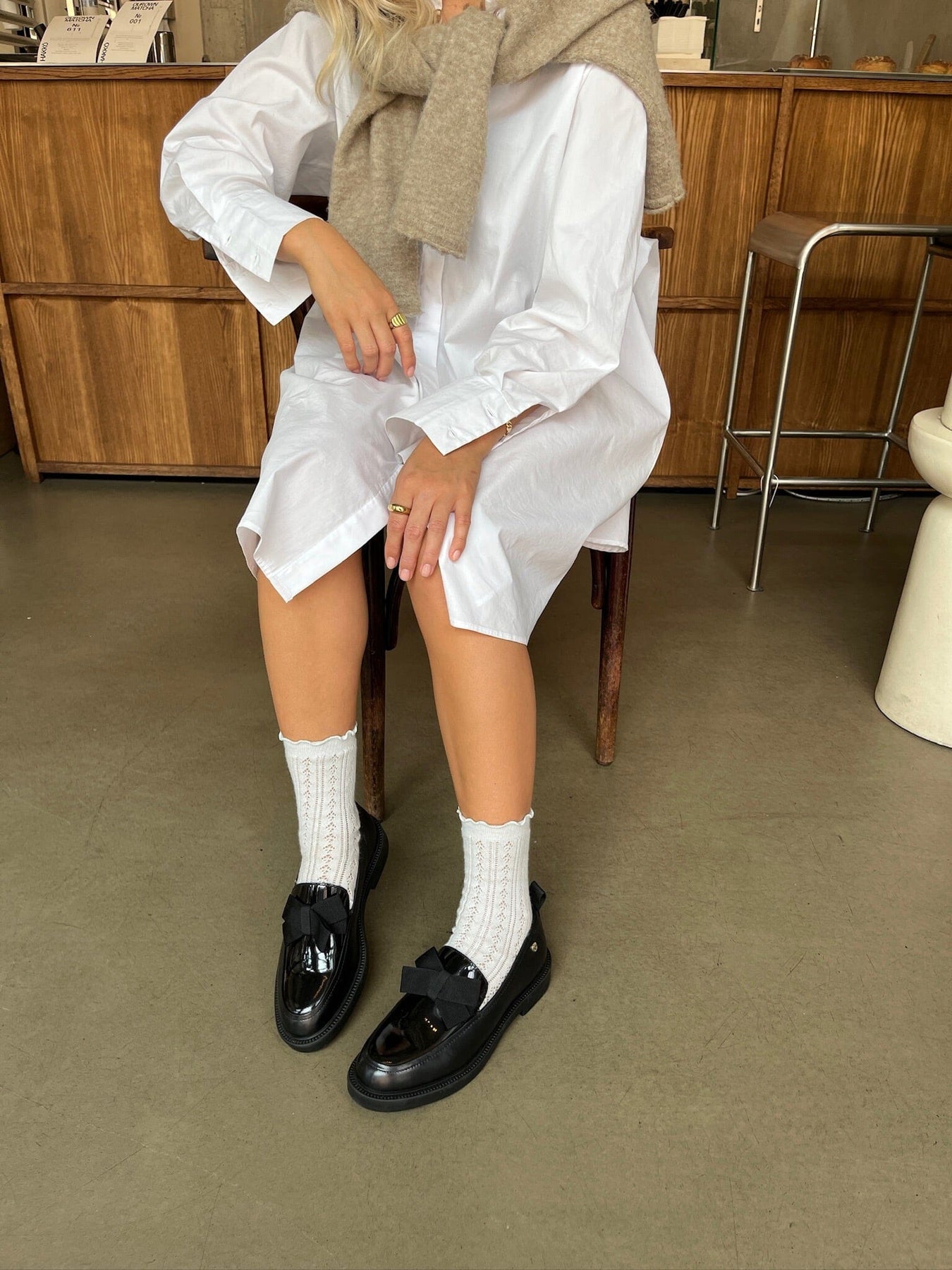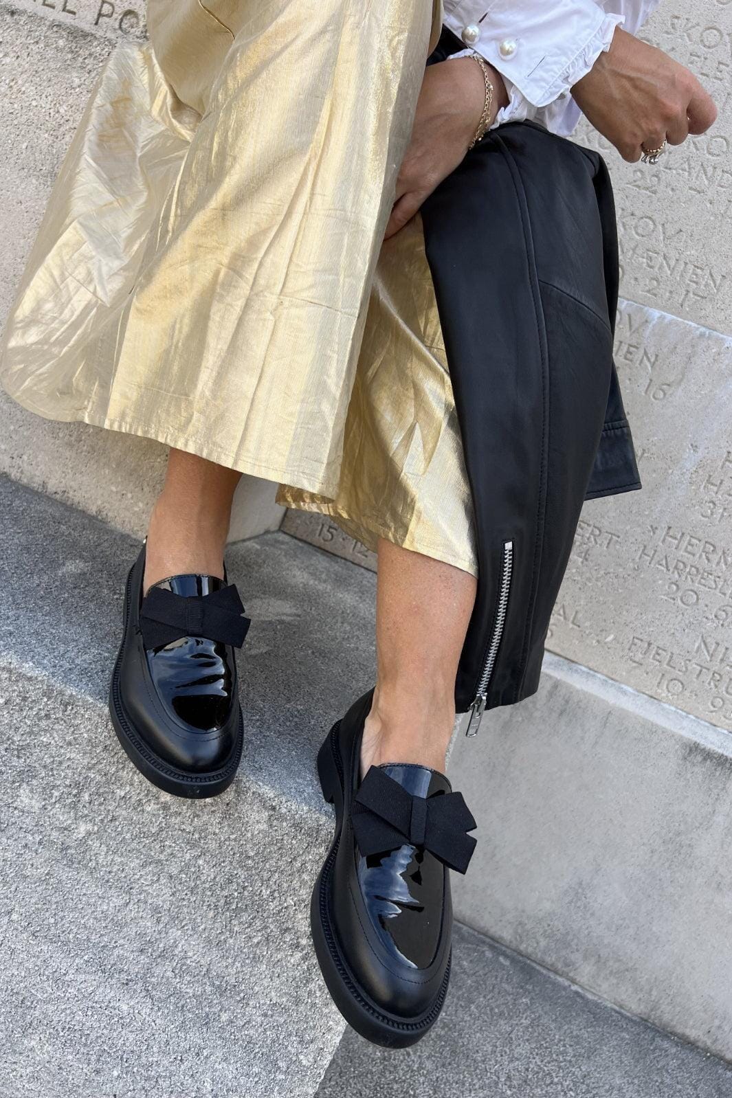 Svart loafers fra Copenhagen Shoes i lærred med lakkdetaljer og sløyfe på overdelen. Skoene har myke gummisåler og spesielle latexskum-innersåler.