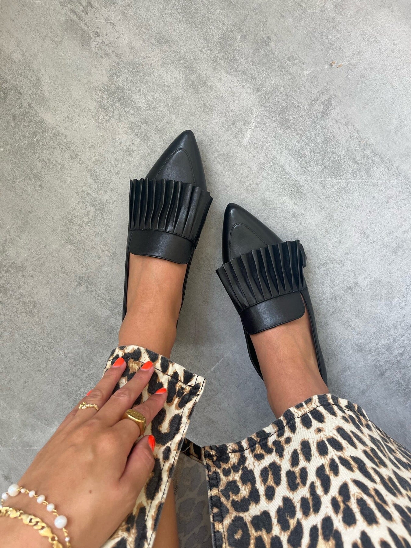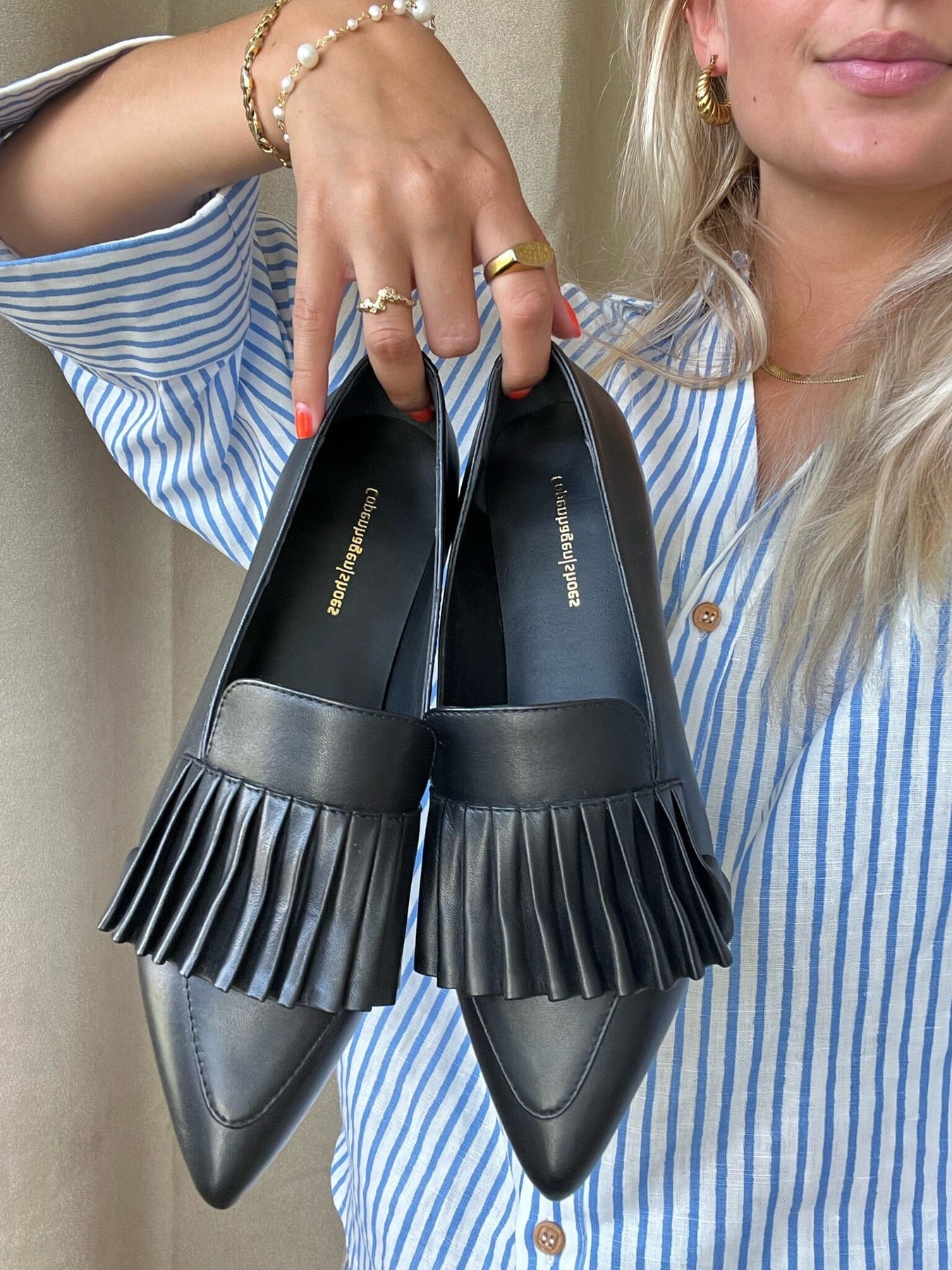 Svarte loafers fra Copenhagen Shoes i lær med spiss tå. Den plisserte fronten gir skoen et vakkert detaljarbeid som kan brukes til både formelle og festlige anledninger.