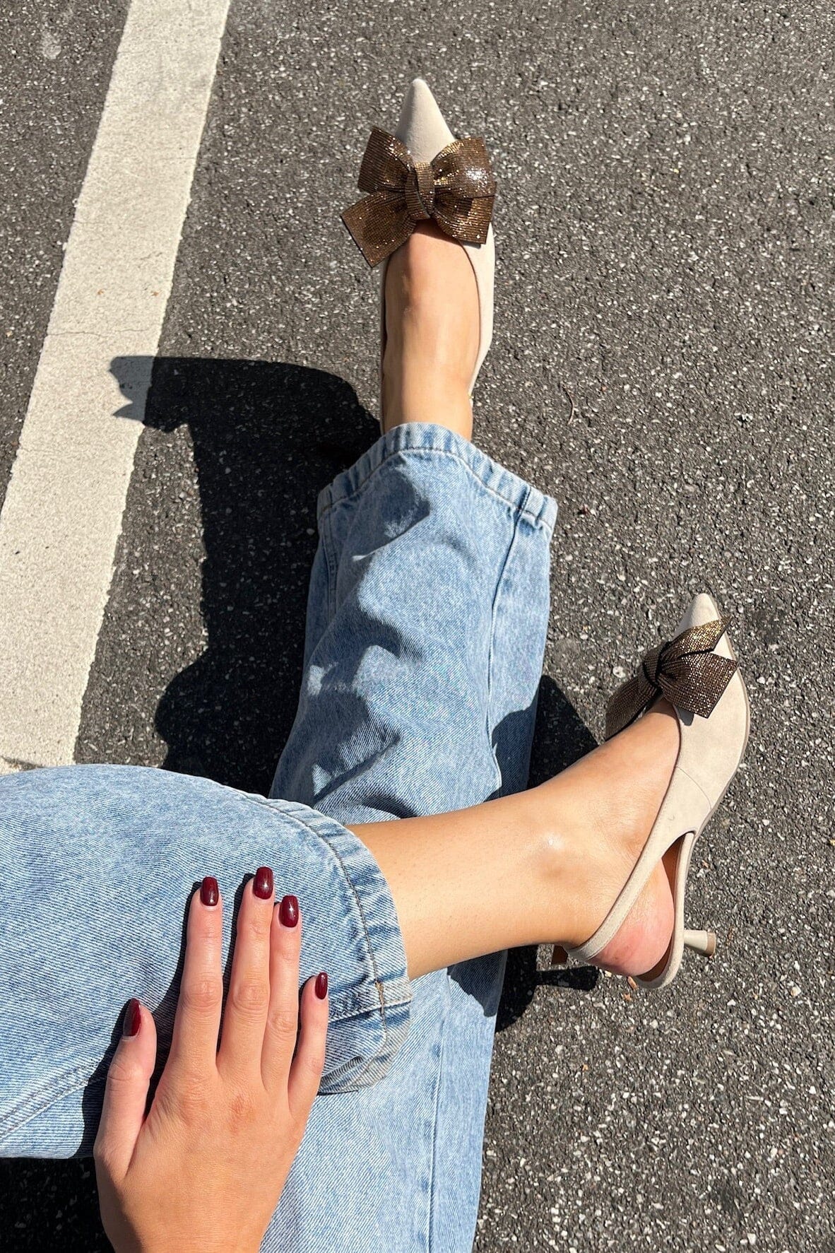 Sko fra Copenhagen Shoes, laget av semsket skinn i en lys kremhvit nyanse. Skoene har en spiss tå og en lav stiletthel.
