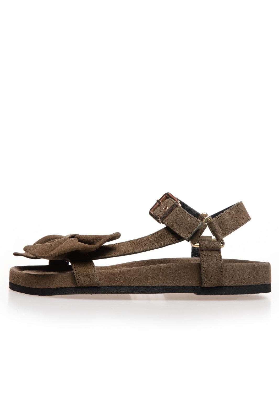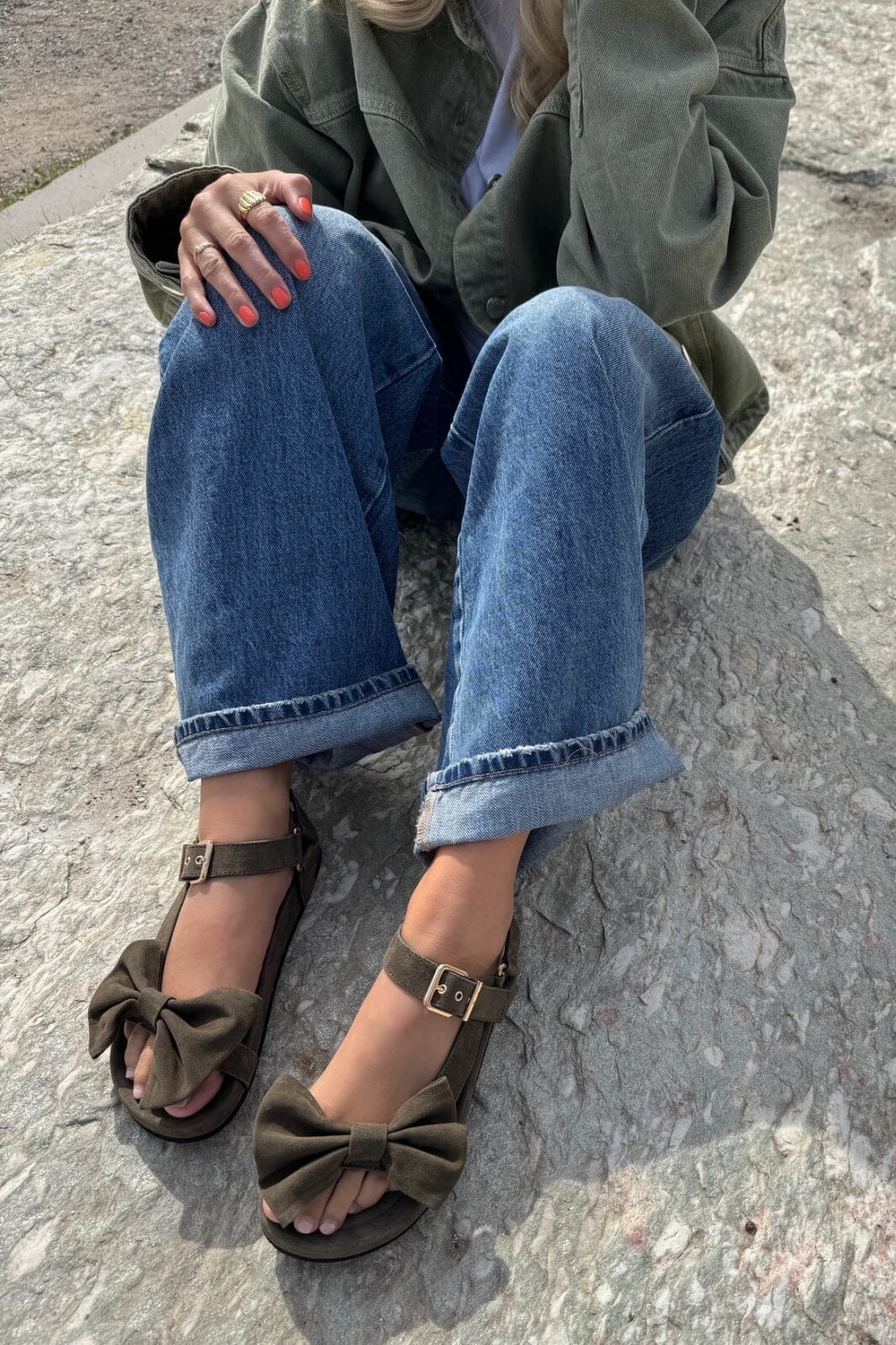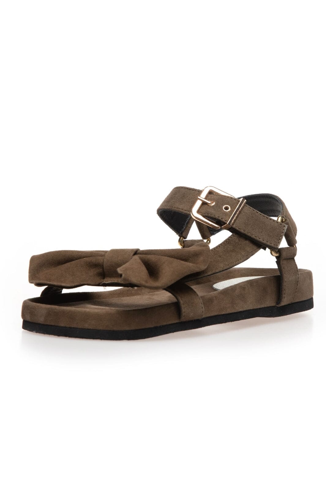 Olivengrønne sandaler i mykt semsket skinn fra Copenhagen Shoes. Sandalene har en dekorativ sløyfe på oversiden og en justerbar ankelrem med gullspenne.