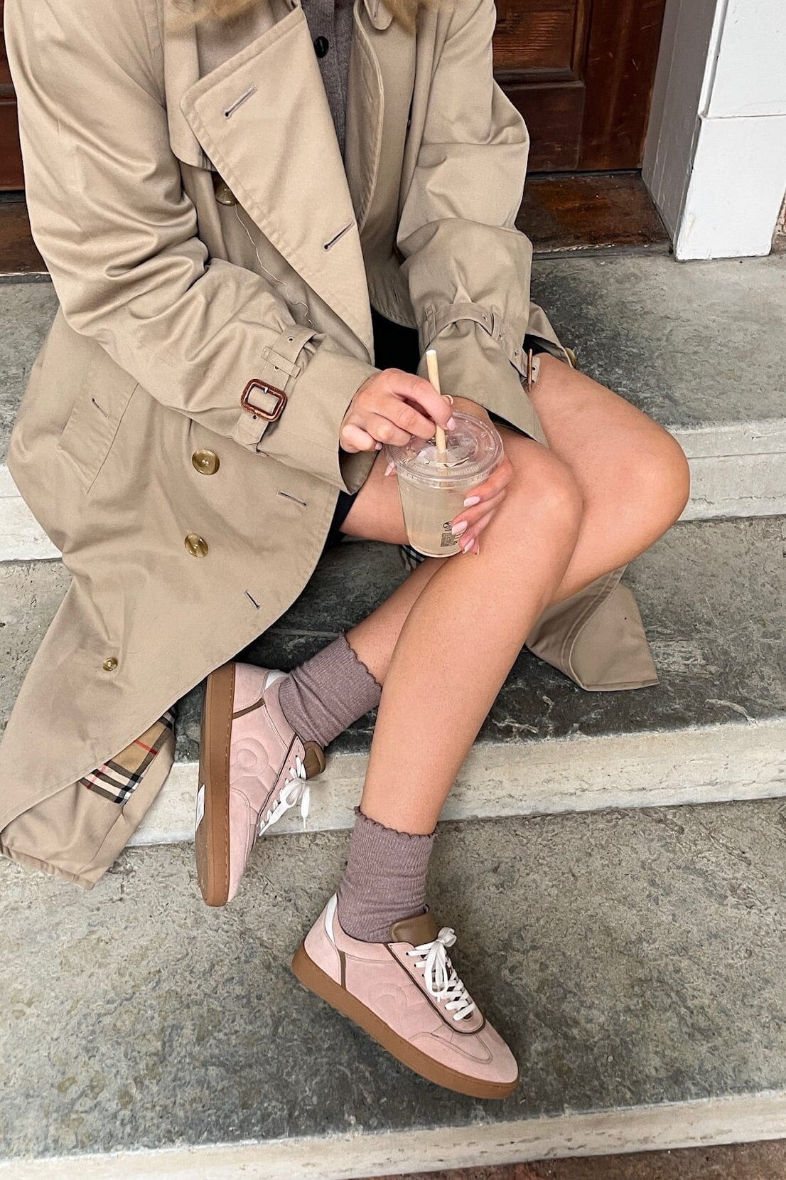 Rosa sneakers fra Copenhagen Shoes, laget av mykt semsket skinn med hvite lisser og en brun såle. Dekorative sømmer på siden.
