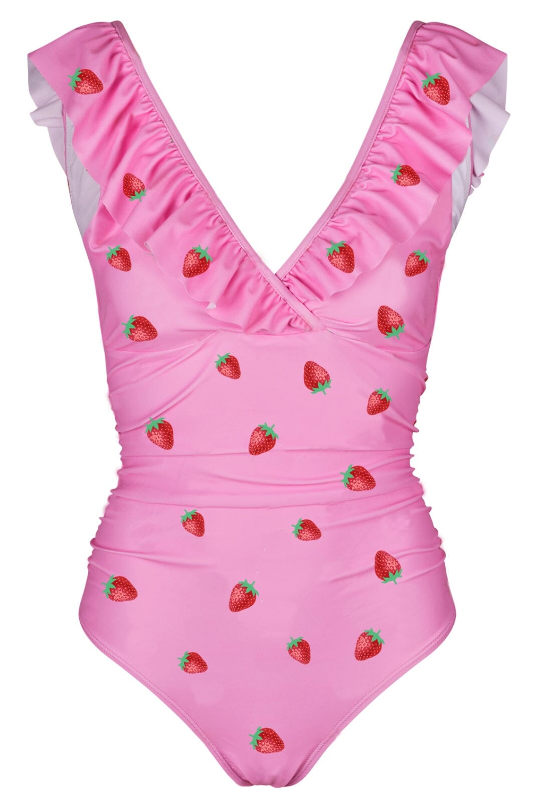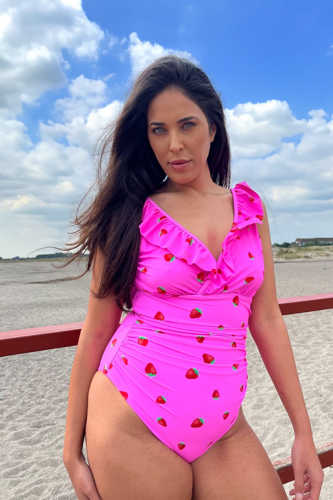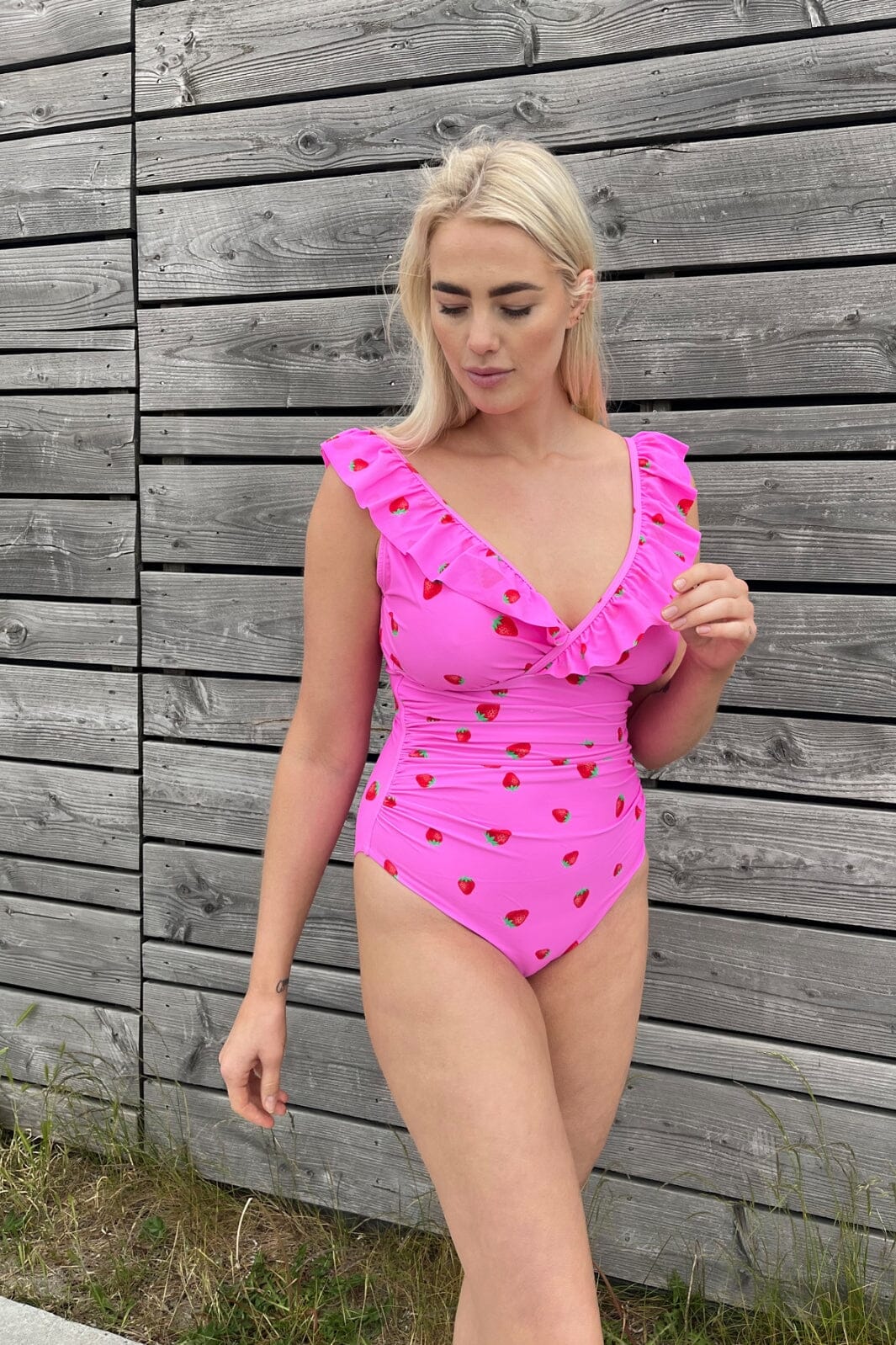Badebukse fra Cras i jordbærrosa med rynket design og volangdetaljer. Den har en wrap-effekt med V-halsutskjæring og et sjarmerende jordbærtrykk over hele drakten.