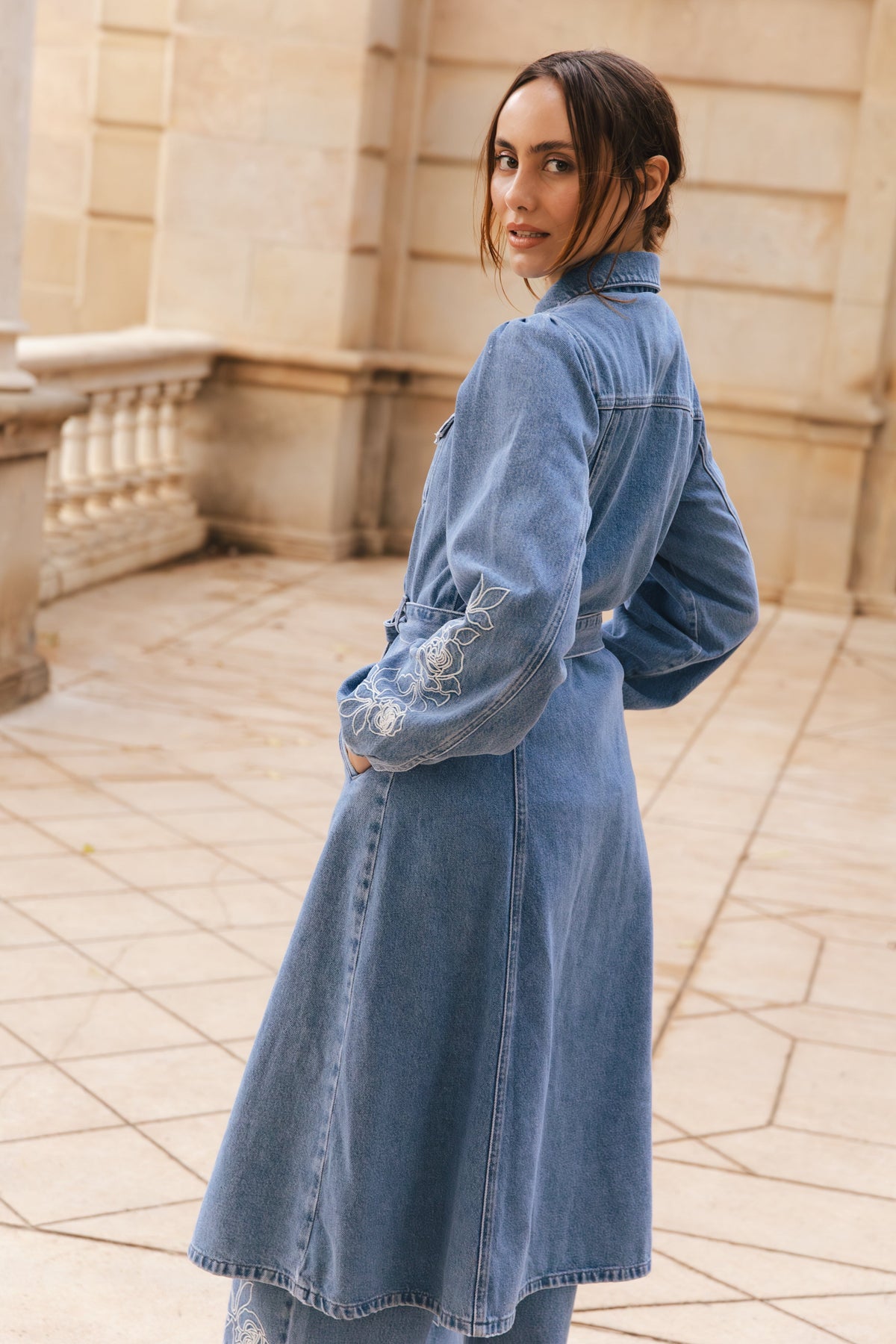 Middels blå denimkjole fra Cras med blomsterbroderi på den nederste delen. Kjolen har skjortekrage, knapper hele veien ned og knytebånd i midjen.
