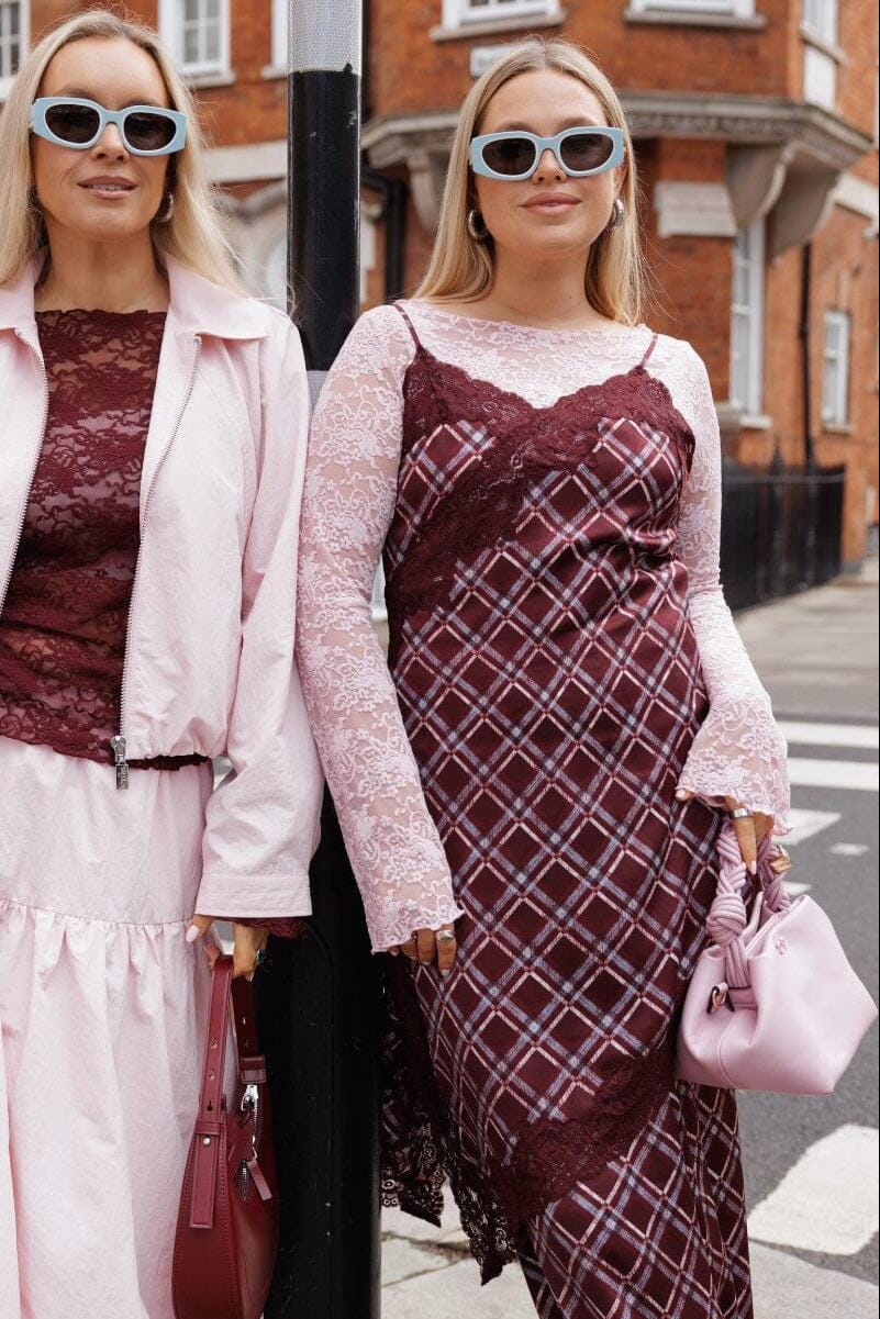 Kjole fra Cras med rutemønster i burgunderrødt. Den har tynne spagettistropper og en asymmetrisk blondekant.