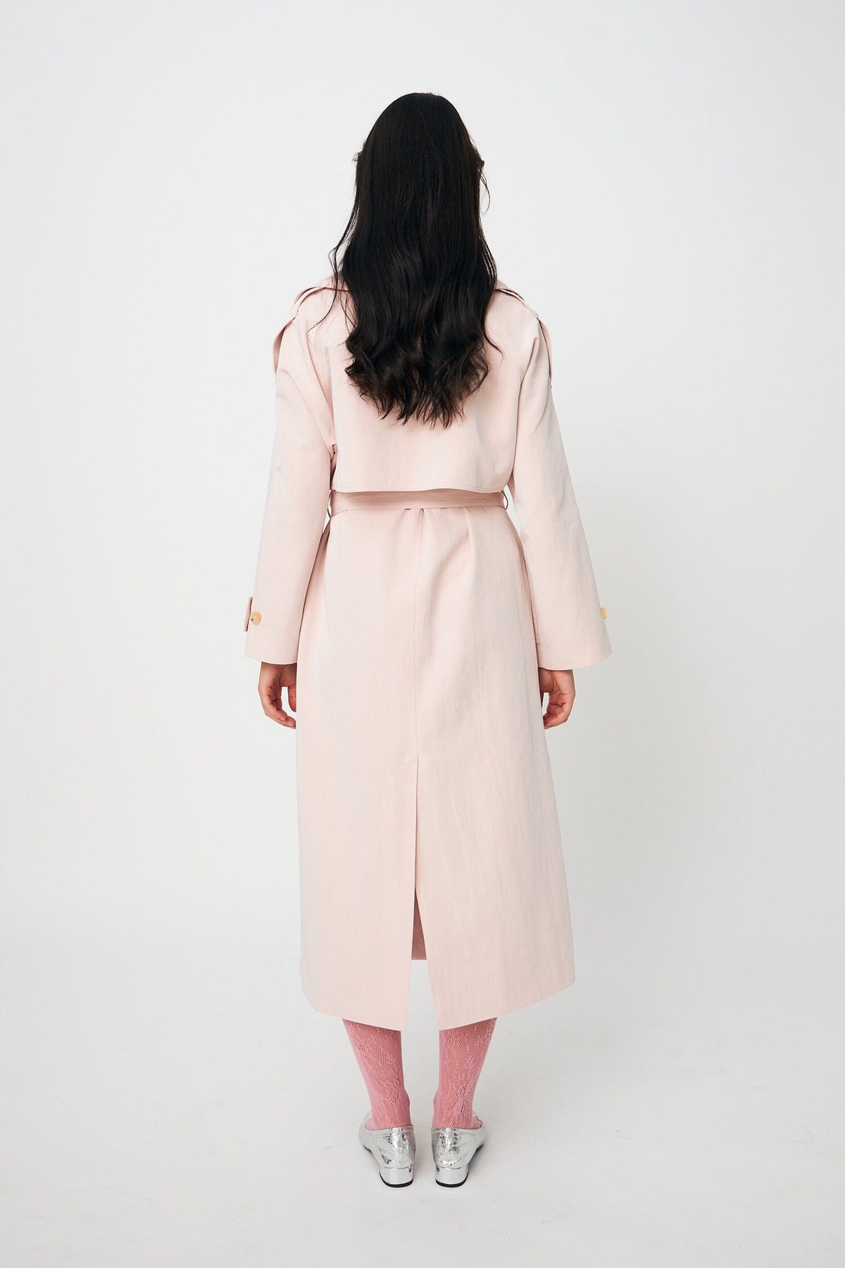 Trenchcoat fra Cras i orkidérosa. Frakken har en dobbeltspent front med store knapper og et belte i midjen.