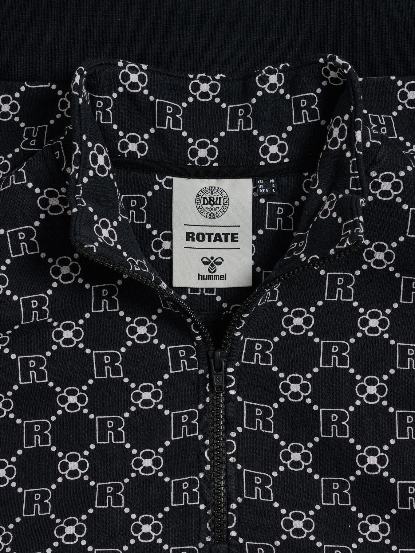 Sort half-zip sweatshirt fra Rotate med R-logo og blomstermønster. Den oversized passformen gir god plass til bevegelse, mens de hvite chevronstripene på ermene skaper kontrast.