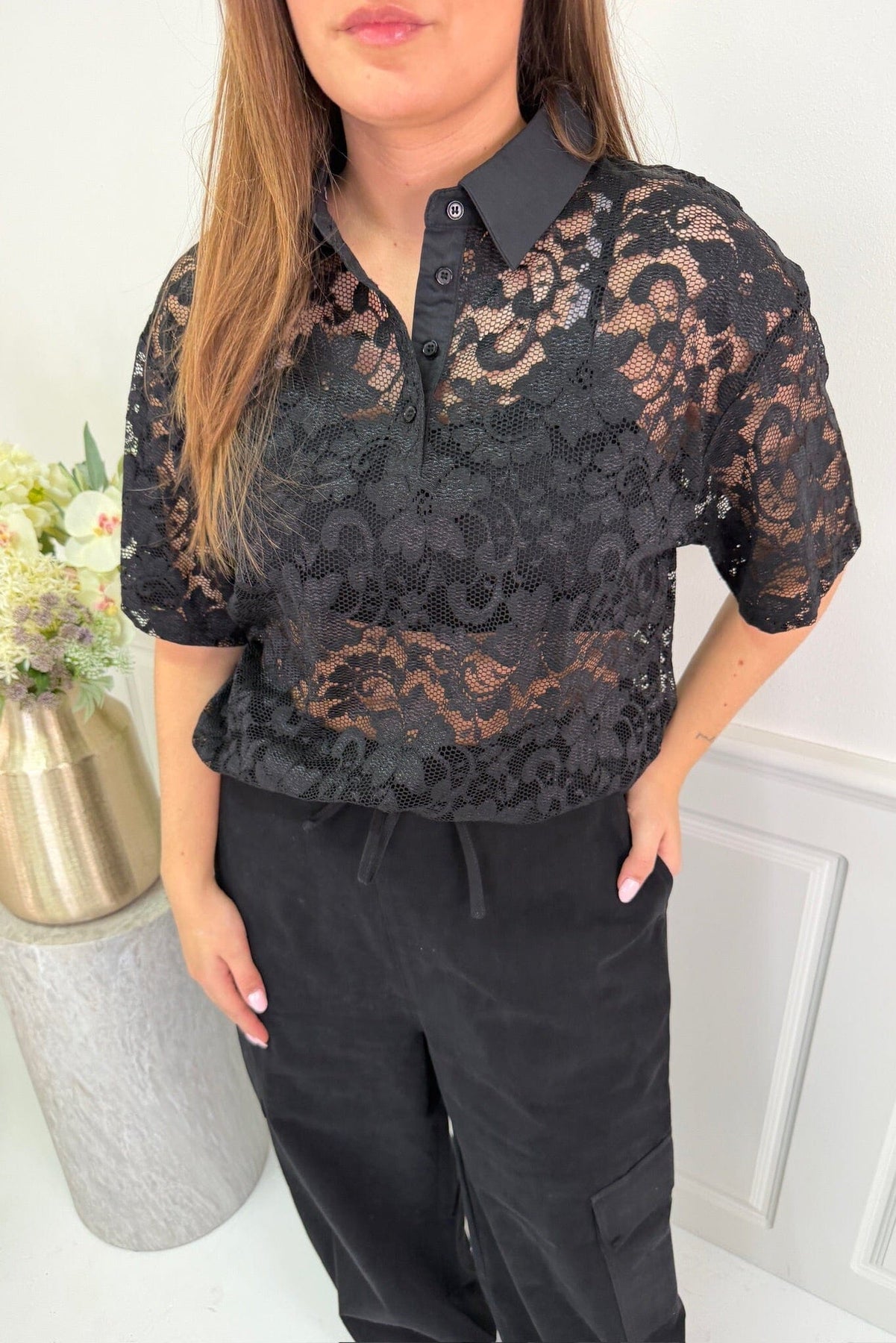 Sort poloskjorte fra Dear Molly med broderi og blondedetaljer. Skjorten har korte ermer og en knappelukking ved kragen.