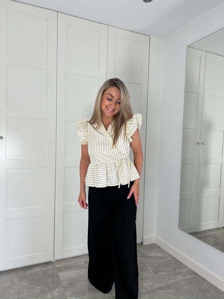 Bukser fra Dear Molly i svart med vide ben og høy midje. Bukserne har et subtilt stripete mønster og en elastisk midje med snøring som gir mulighet for å justere vidden.