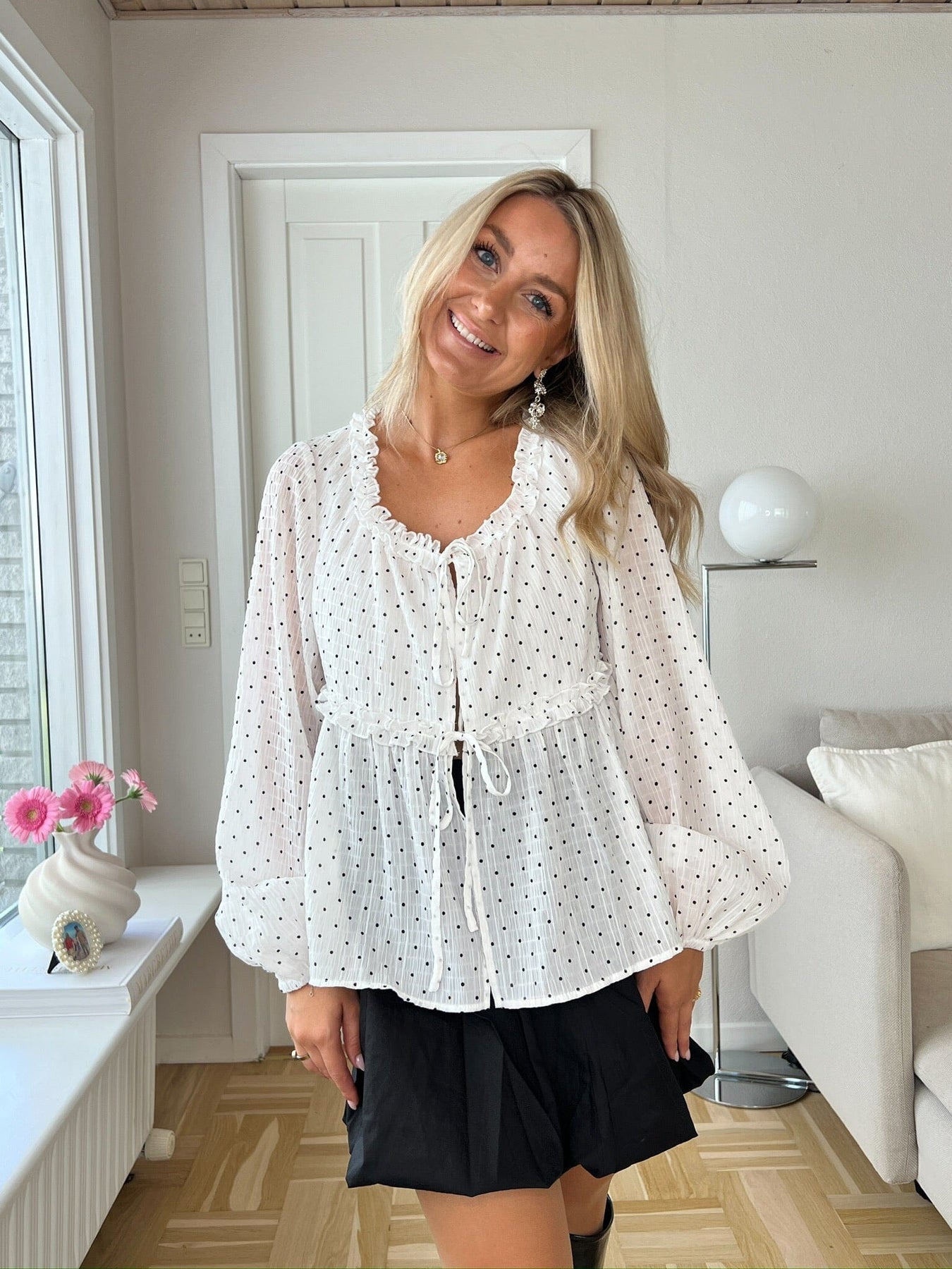 Hvit bluse med svarte prikker fra Dear Molly. Blusen har lange ermer og en rund halsutringning med volanger.