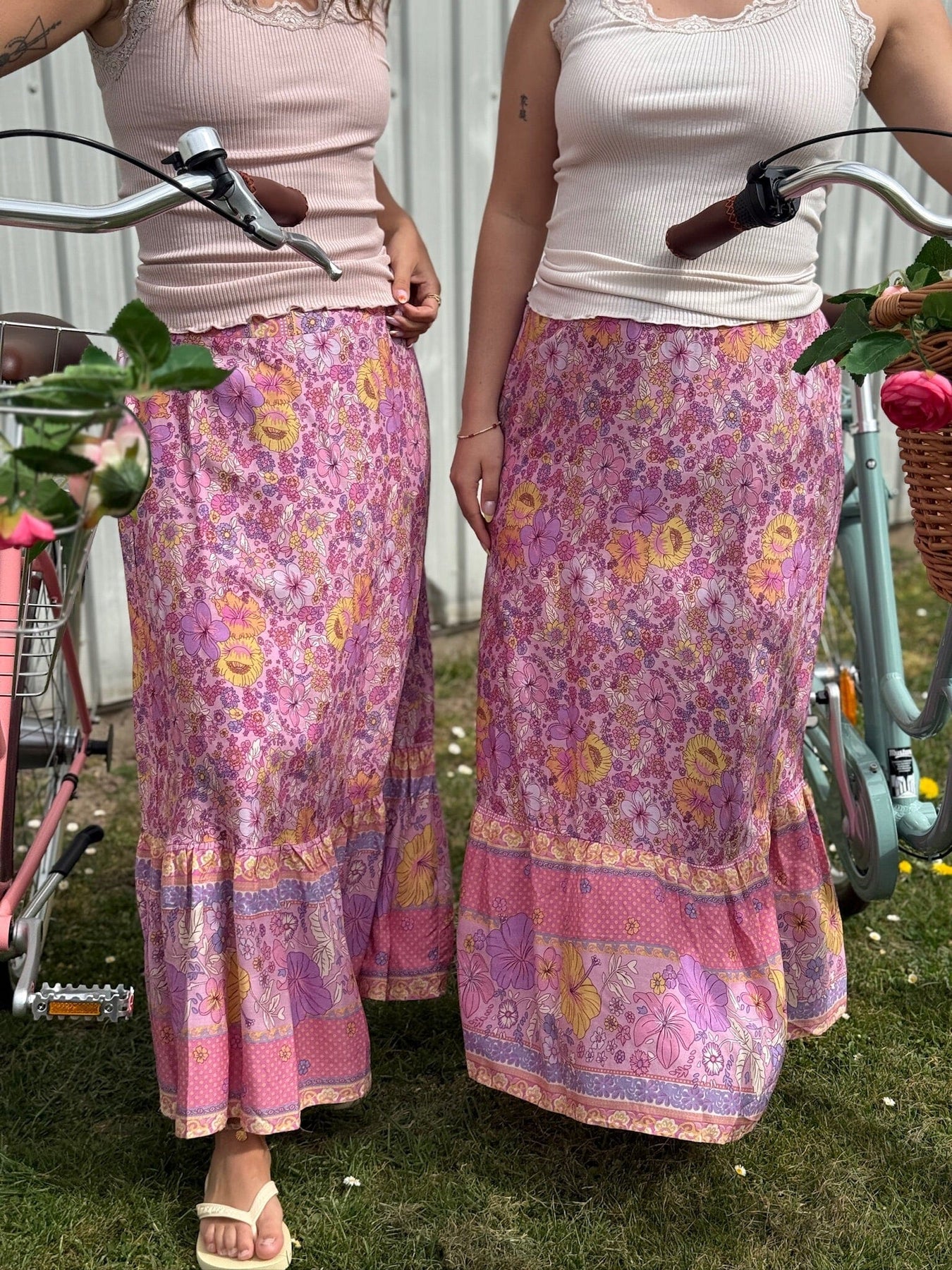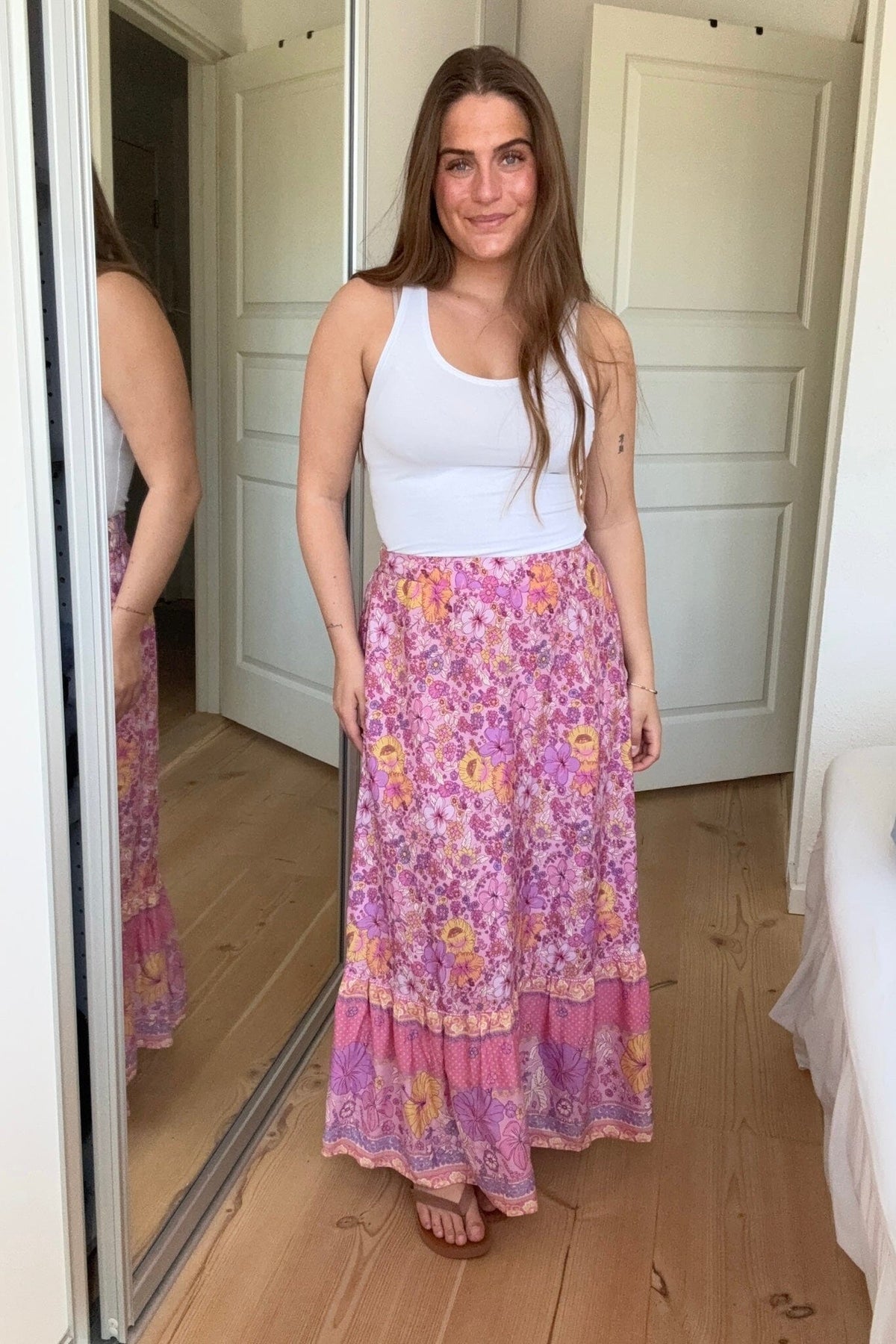 Rosa maxiskjørt fra Dear Molly med blomsterdesign i rosa og lilla nyanser. Skjørtet har en løs passform og en volangkant nederst som gir et mykt og feminint uttrykk.