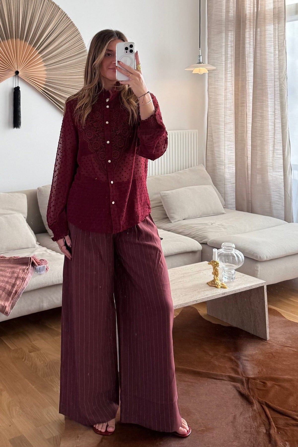 Vinrød skjorte fra Dear Molly med blomster- og polkaprikmønster. Skjorten har broderi, perledetaljer og volanger, og den lukkes med knapper.