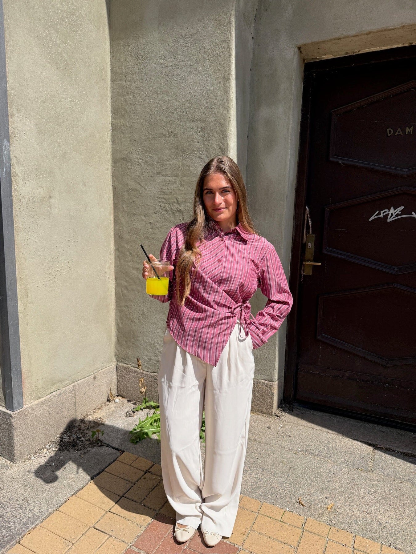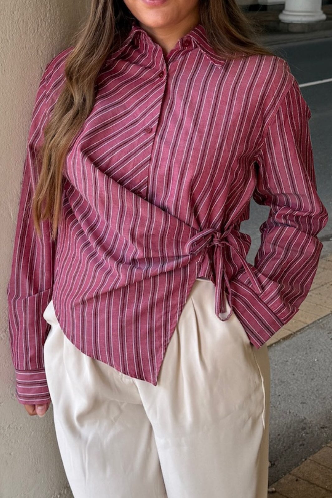 Vinrød stripet skjorte fra Dear Molly. De vertikale stripene på den vinrøde bunnen gir skjorten et grafisk uttrykk.