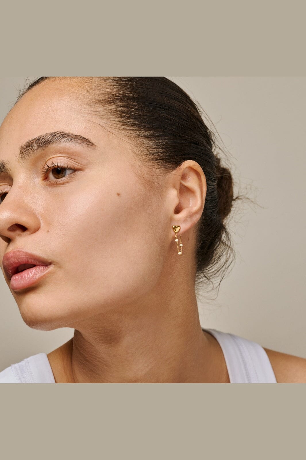 Øredobber fra Enamel Copenhagen med hjerteformet topp og hengende kjede. De små hvite perlene på kjeden skaper en fin kontrast til det gullbelagte sølvet.
