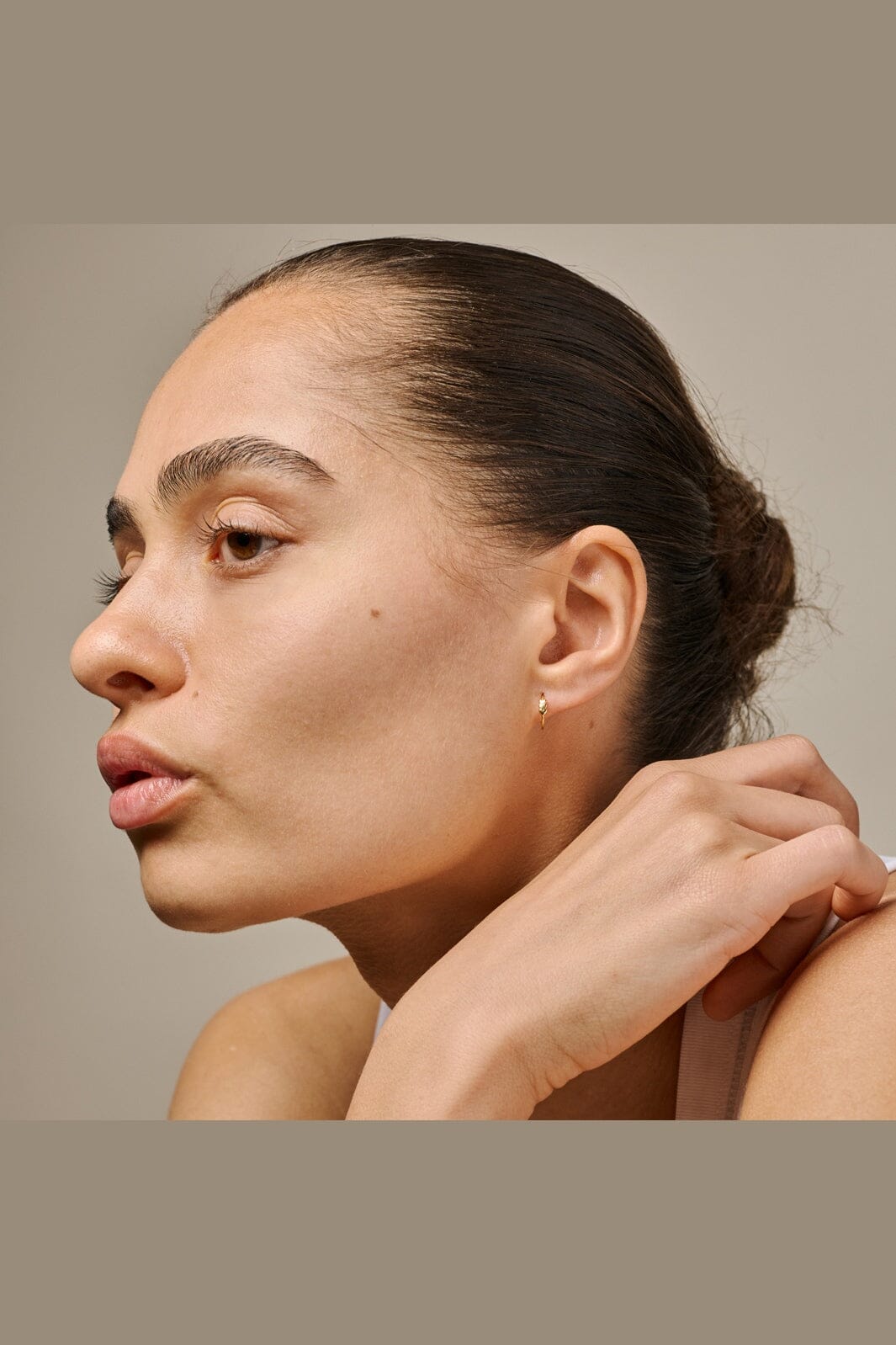 Gullfargede øreringer fra Enamel Copenhagen med tre små hjerter på forsiden. Øreringene har en tynn og lett twist-form med en praktisk dreiemekanisme.