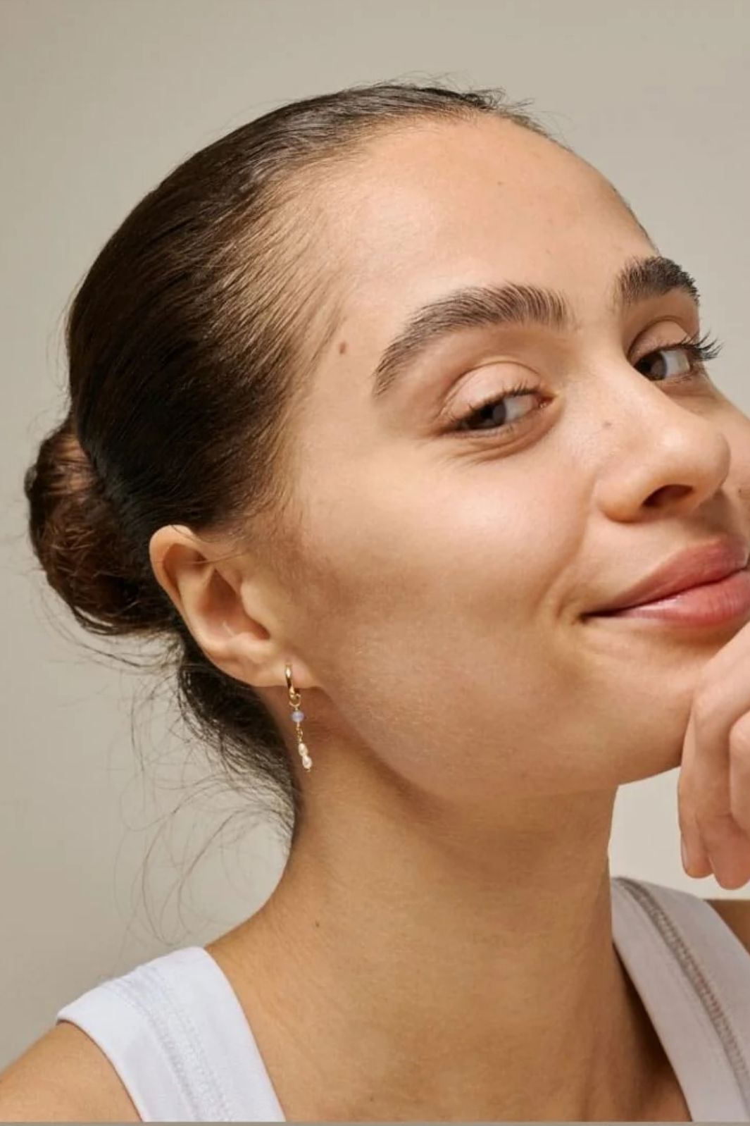 Hoops fra Enamel Copenhagen med blå kvarts og hvite perler. Øreringene har en gulldekket ring med en blå kvartsperle og to hvite perler som anheng.
