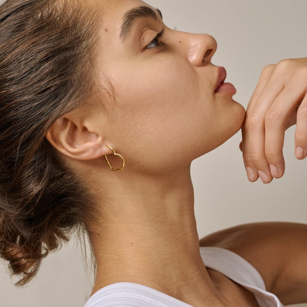 Hjerteformede øredobber fra Enamel Copenhagen. Håndlagde hoops i gullbelagt resirkulert sterling sølv med en strukturert overflate og organisk form.