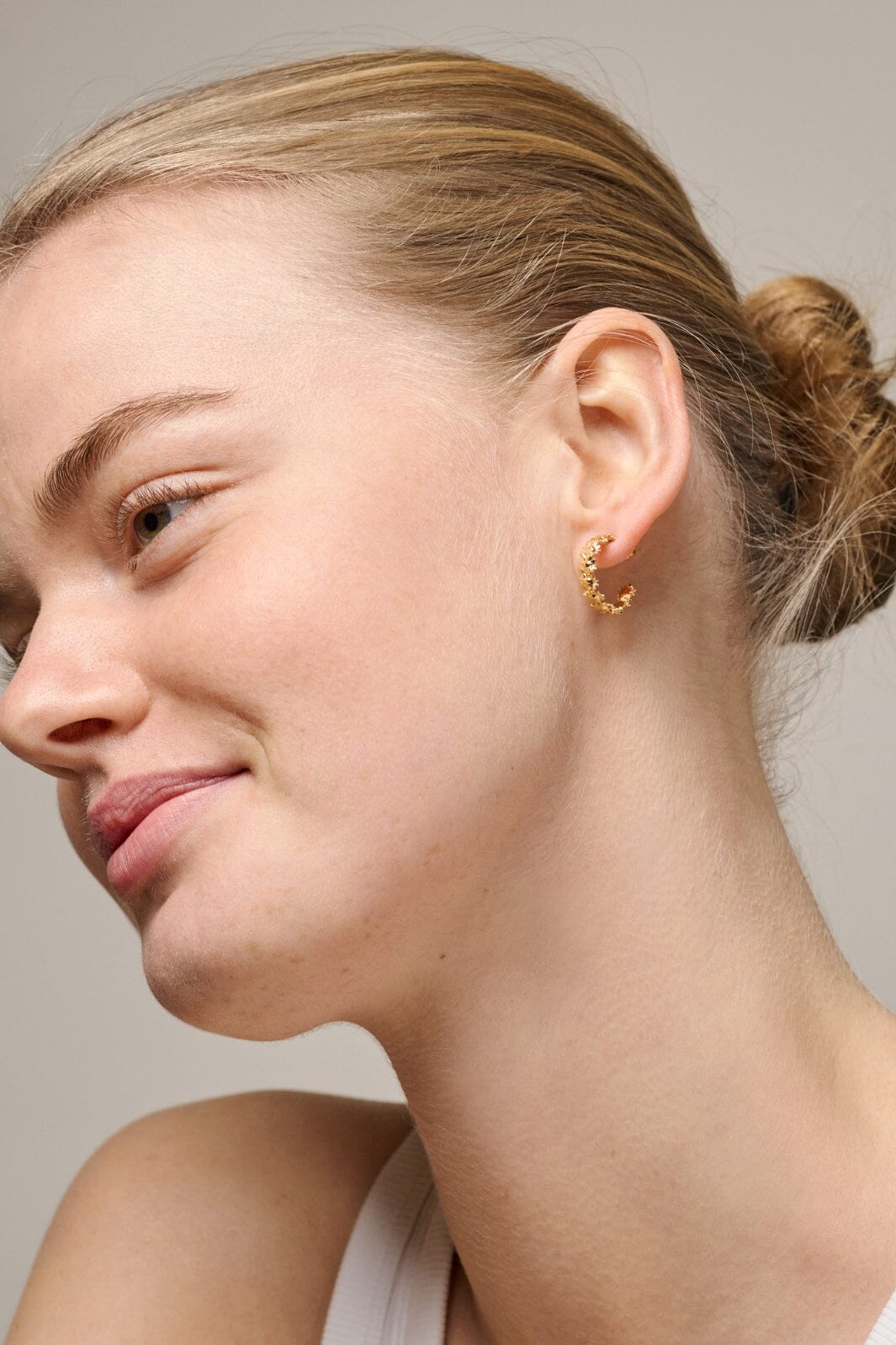 Gullbelagte hoop-øreringer fra Enamel Copenhagen med et solsikkekransdesign. Øreringene er utformet i en buet form med detaljerte blomstermotiver hele veien rundt.