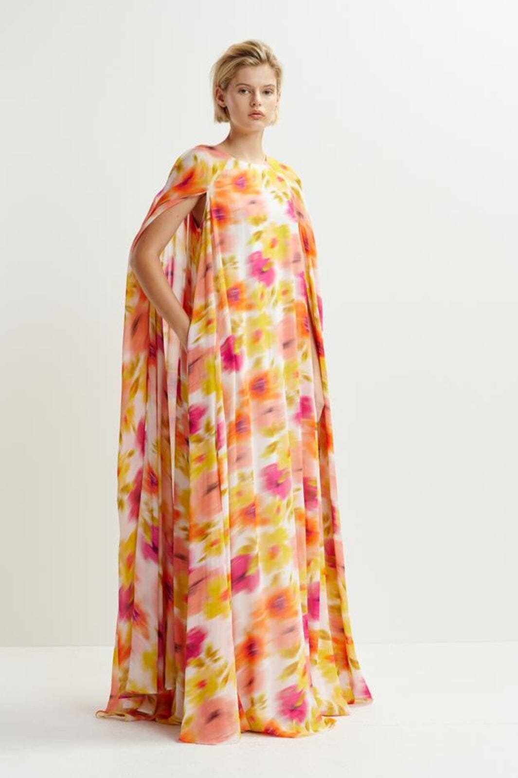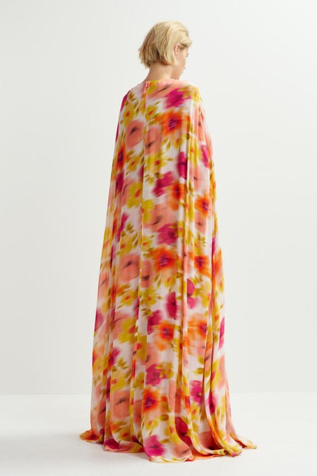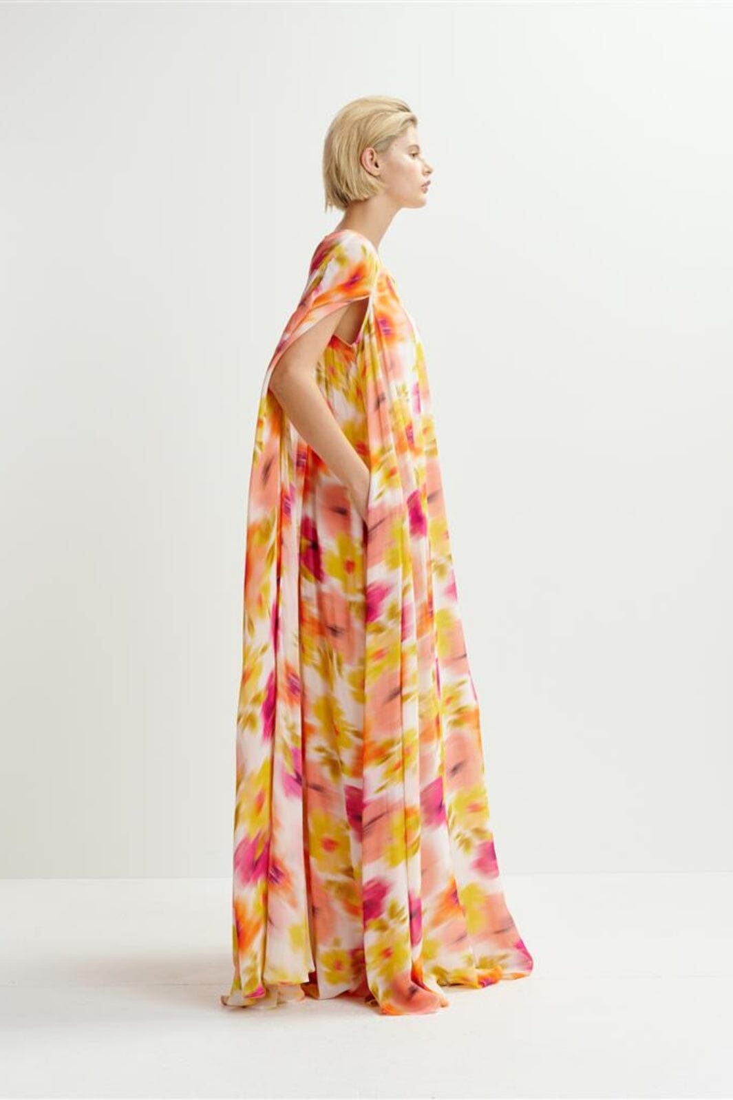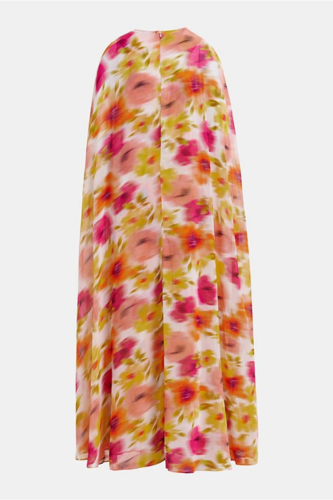 Kjole fra Essentiel Antwerp i lett viskosekvalitet. Kjolen har et blomstermønster i rosa, oransje og gult på off-white bunn. De brede ermene skaper en kappeeffekt.