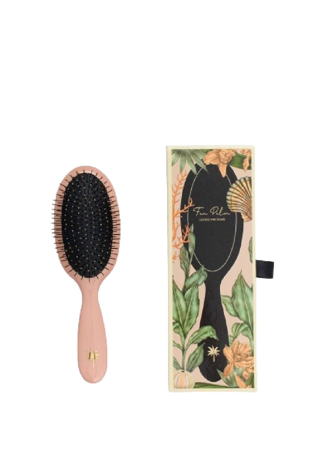 Rosa hårbørste fra Fan Palm med nylonbørster og gullbelagte spisser. Børsten kommer i en dekorert eske med blomsterdesign og har en glitrende effekt i det rosa designet.