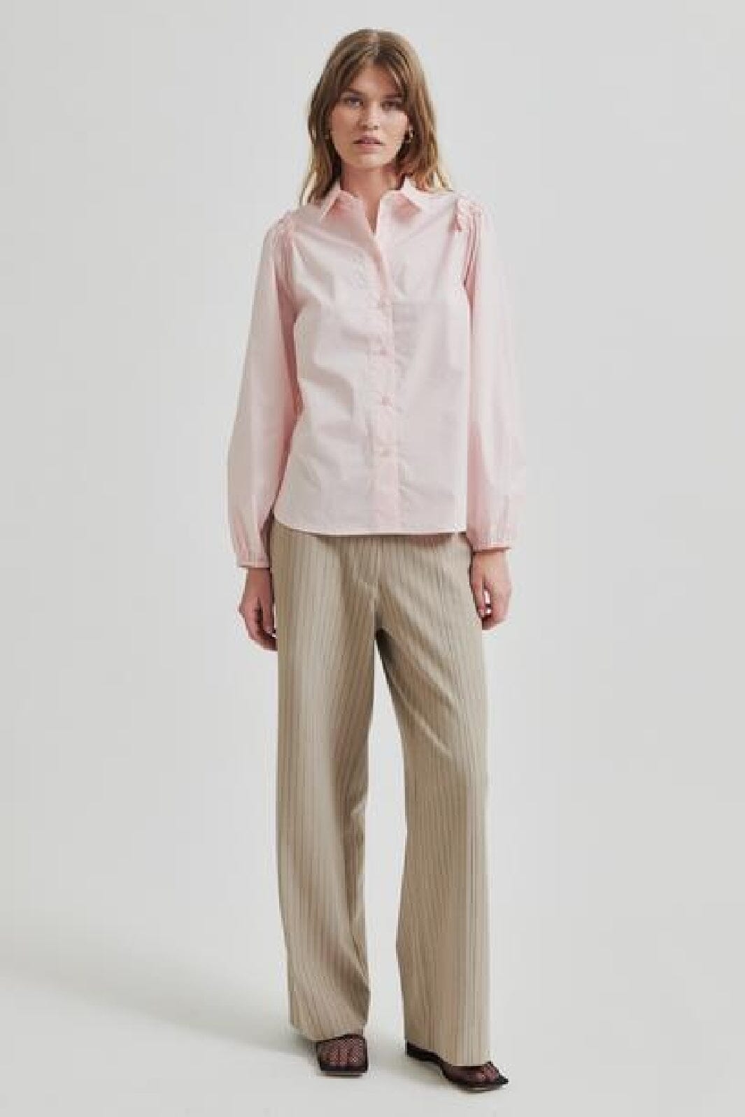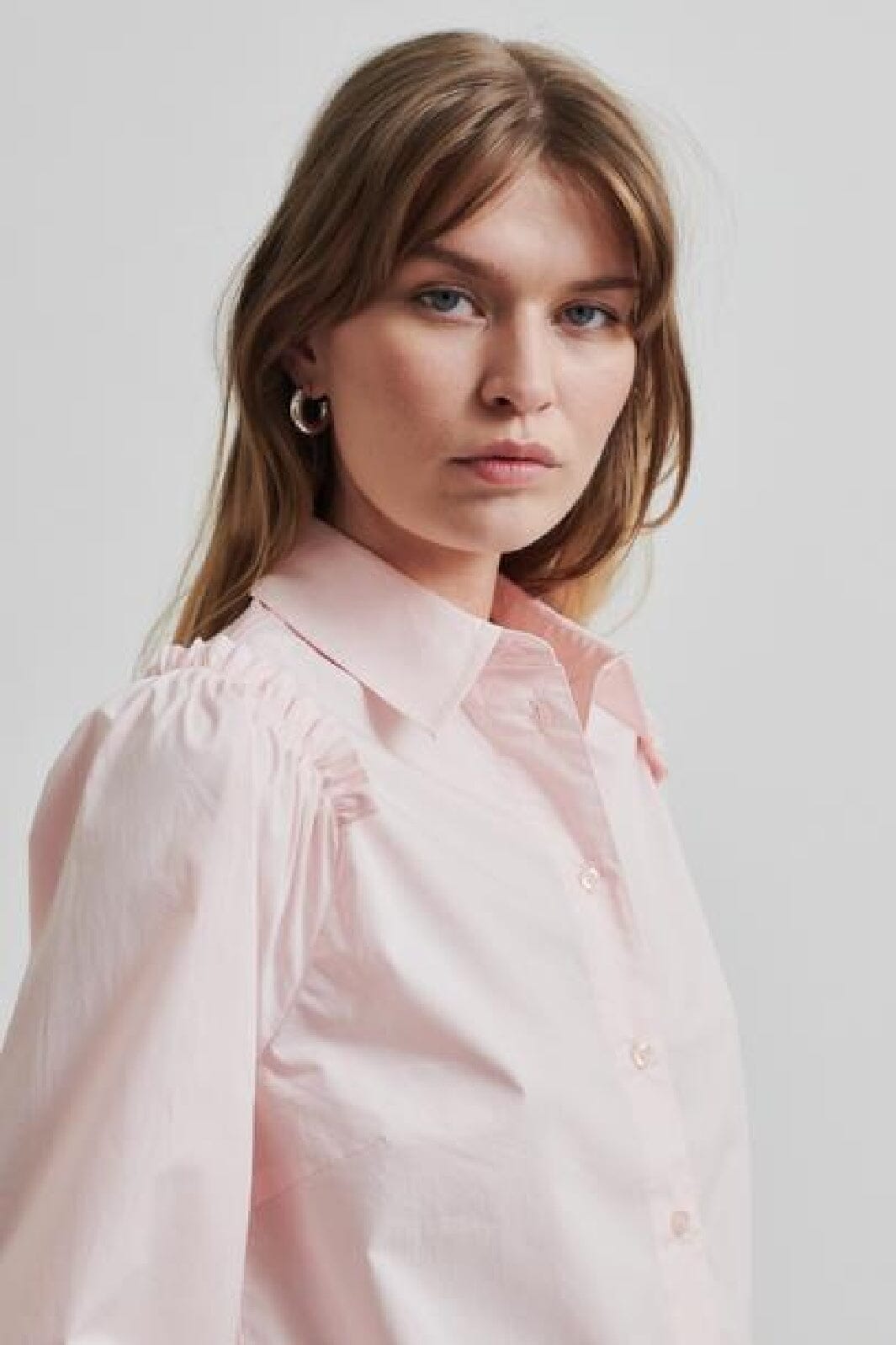 Rosa skjorte fra Second Female med knapplukking foran. Skjorten har volangdetaljer på skuldrene og skjortekrage. De lange ermene har elastikk ved håndleddene.