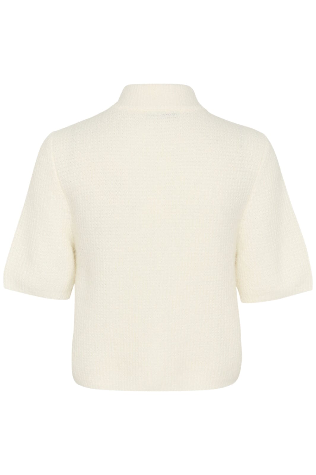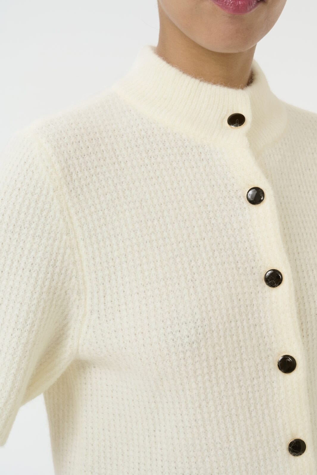 Kort cardigan fra Gestuz i ivory med høy hals og korte ermer. Den er laget av en blanding av ull og polyester med stretch og har knapper hele veien ned foran.