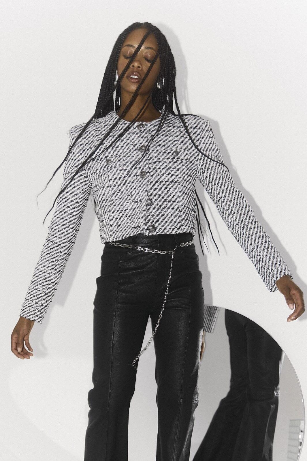 Sort-hvit cropped jakke fra Gestuz med strukturerte skuldre og striper i lurex twill. Jakken har en kort lengde og knapper foran.