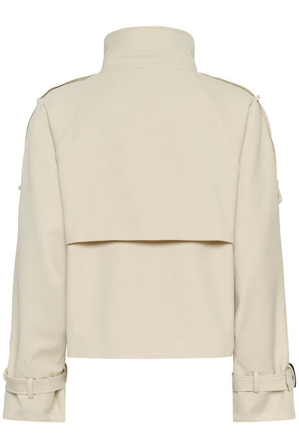 Kort trenchcoat fra Gestuz i en beige farge. Jakken har dobbeltspent design med store svarte knapper og spenndetaljer ved kragen og ermene.