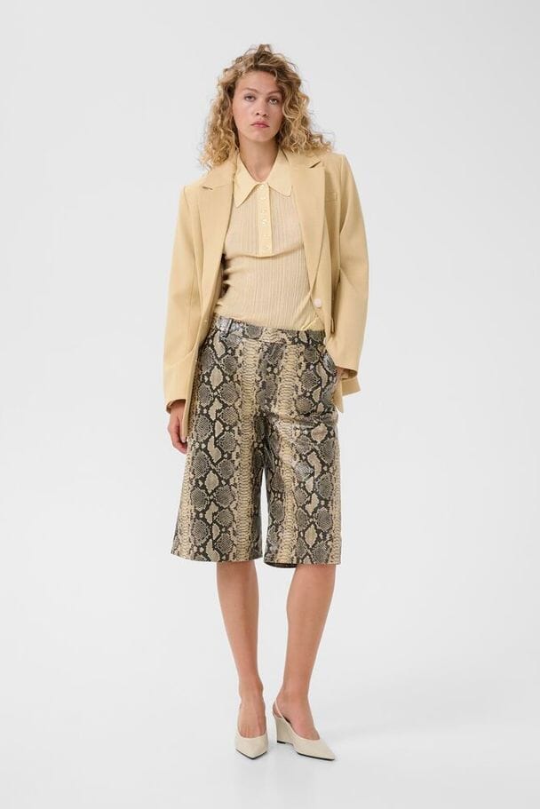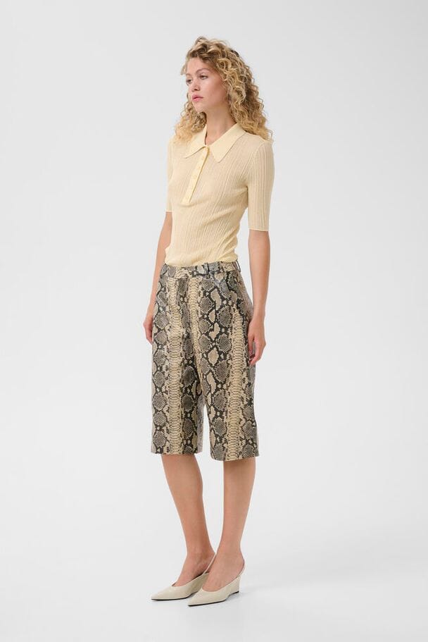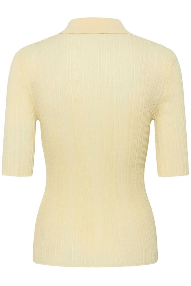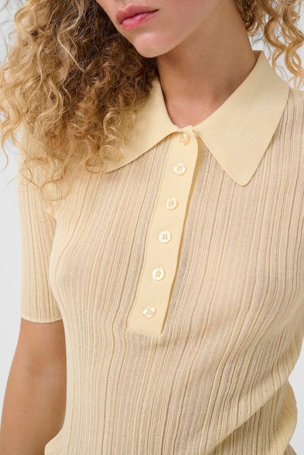 Ribbet polo-topp fra Gestuz i en lys kremfarge. Toppen er laget av 82% bomull og 18% polyamid med en klassisk krage og knappelukking.