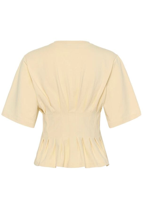 En lys kremfarget t-skjorte fra Gestuz med plissert design rundt midjen. Den har korte ermer og en rund halsutringning.