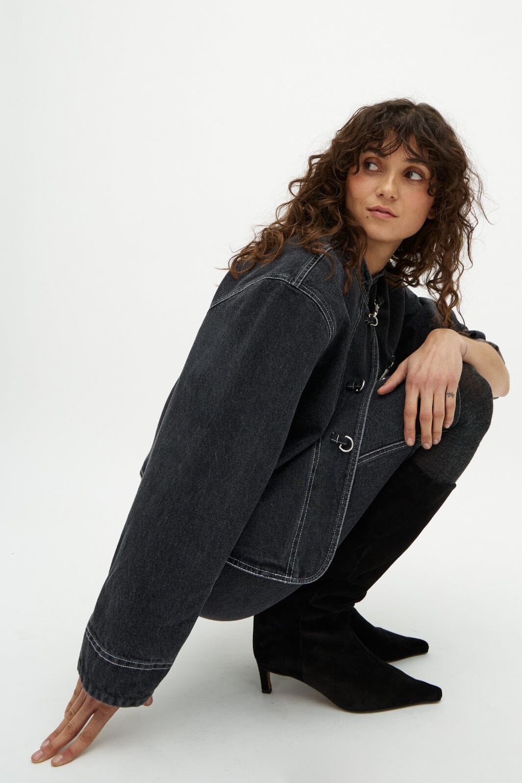 Grå jakke fra Global Funk laget av bomull. Jakken har tre metallspenner foran og en høy krage.